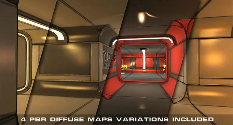 You can create any size you want rooms with corridors! you also have prefabs that enablethe creation of large podium. 4K textures set is provided (Diffuse (4 styles), metal, AO, normal).