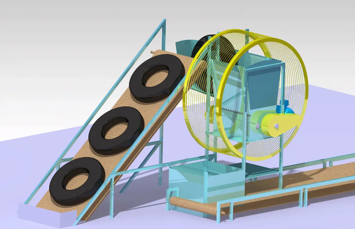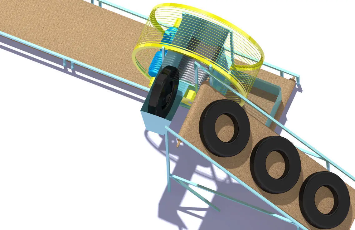 Shreder tyre with capacity of destrucction of 625ton by hour, auto recycling, and tamiz of 2" * 2" (5 x 5 cm), 40 cutter solid with garfio for hole down the tyre, motoreductor, motor of 25KW or 50KW, band transport,
