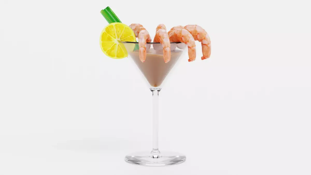 A realistic shrimp cocktail arranged in a clear V-shaped glass with detailed food elements. The setup includes a smooth cocktail sauce base, topped with evenly placed shrimp around the rim, each with a high-quality texture and clean curvature typical for chilled shrimp rings. A fresh lemon slice sits on the edge of the glass, and a single celery stick is placed into the sauce for an authentic, visually balanced composition. The model stays universal and suitable for close-up food renders, product shots, menu visuals, or any scene that benefits from a clean, polished representation of a classic appetizer.