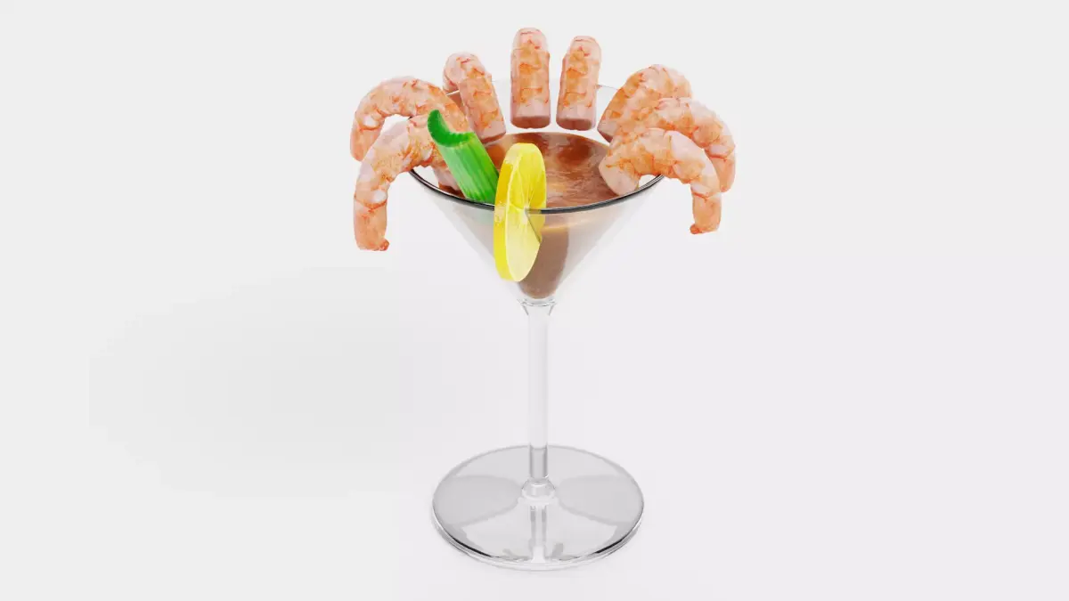 - Detailed shrimp cocktail setup: glass, sauce, shrimp, lemon slice, and celery garnish
