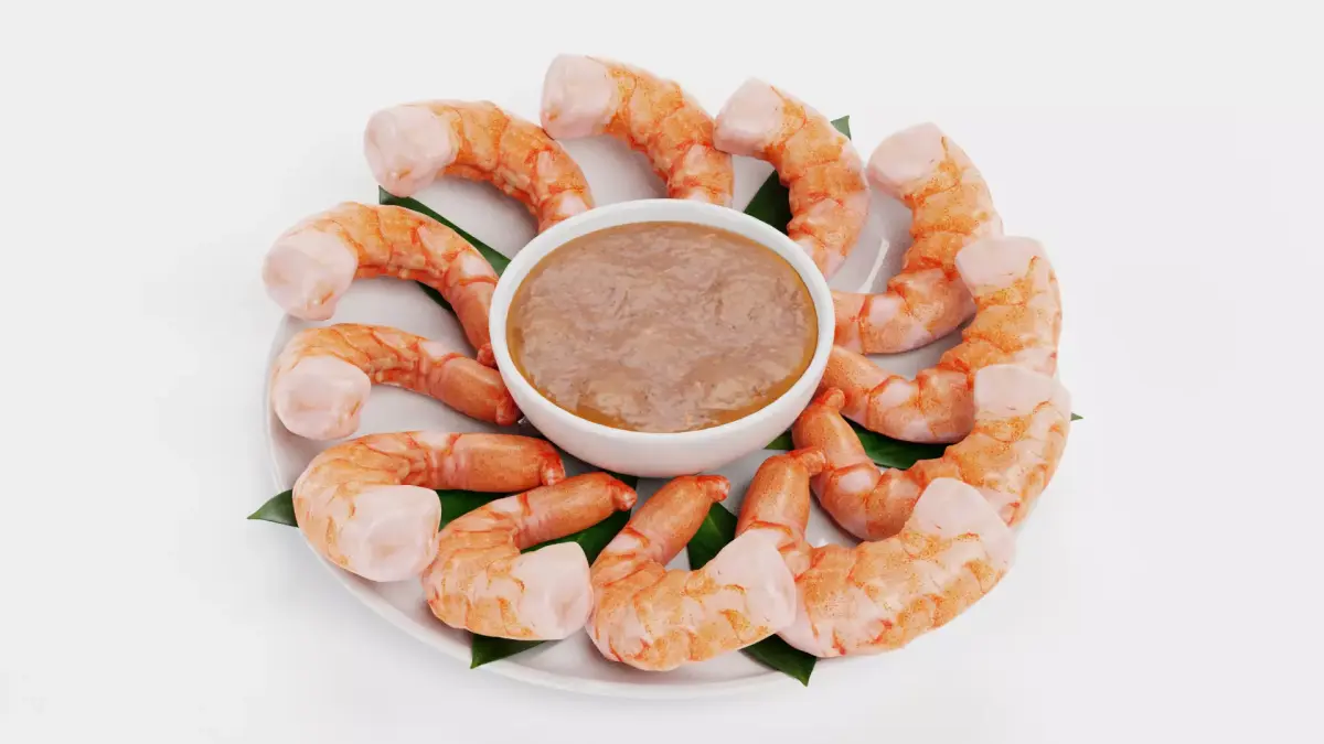 - Central dipping bowl with cocktail sauce for clear scene focus