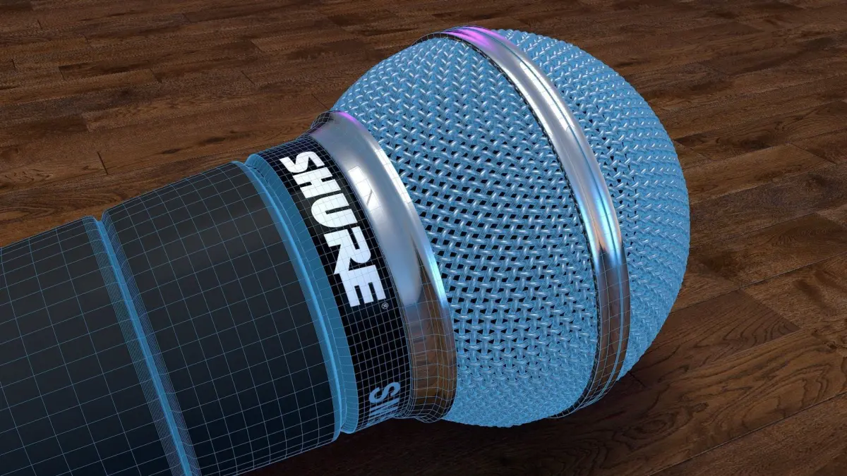 Here you see a Shure SM58 Microphone, with a wire grill Mesh so the render looks more realistic, and it will inner reflect the light. The mesh set up, make the render a lot faster when you'll be using this in any animation.