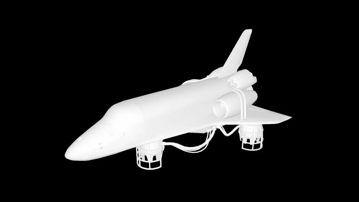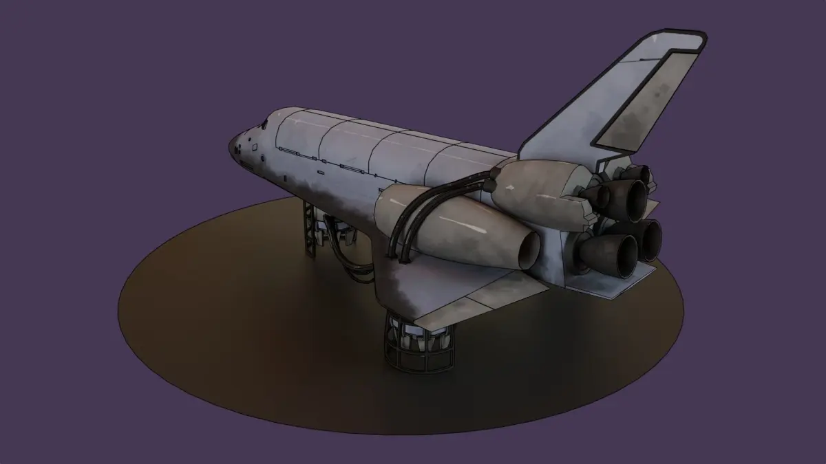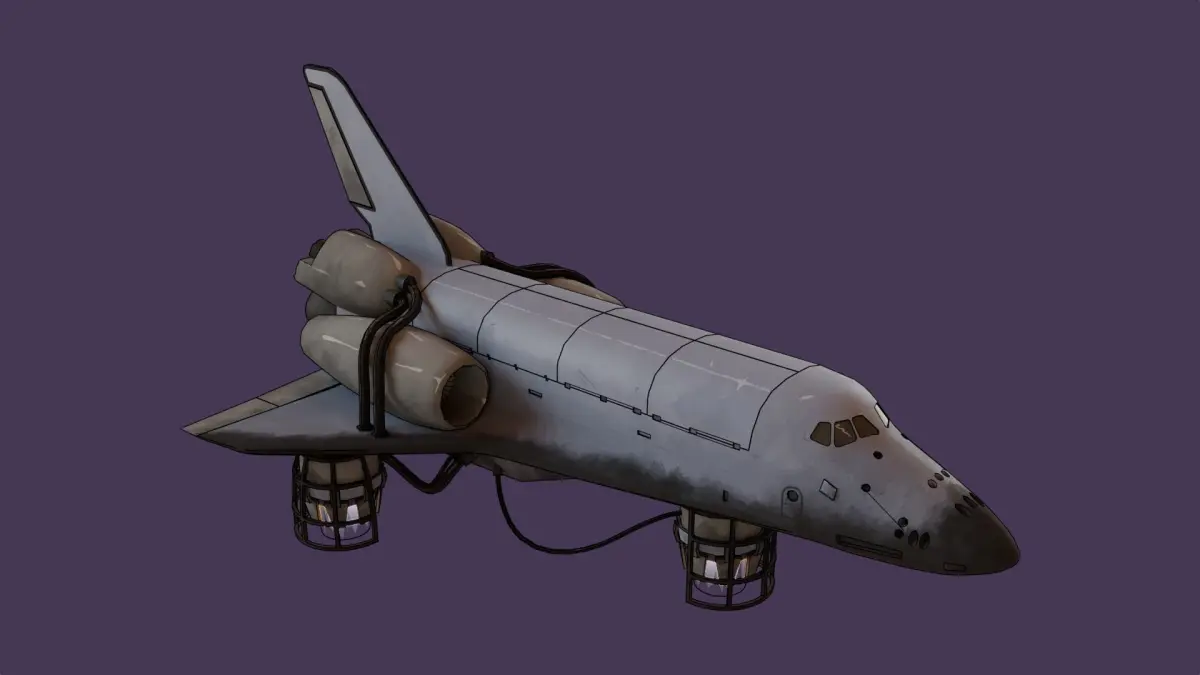 3D model of a spacecraft in a dieselpunk style with cartoonish texture rendering. The ship boasts heavy, rugged shapes typical of dieselpunk, with visible seams and fastenings. The hull mimics aged and weathered metal, contributing to a sense of antiquity and wear. Unusual support struts that hold the ship aloft, and a complex array of pipes emanating from the engine, enhance the industrial vibe. All this is combined with the pronounced caricature stylization inherent to cartoon images, creating a whimsical and unique visual.