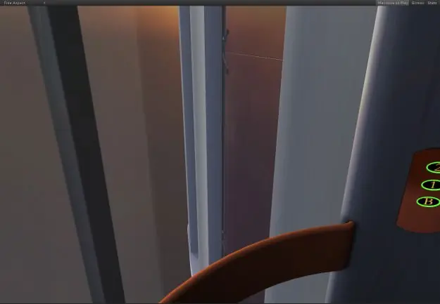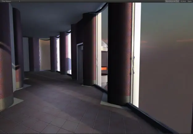 A realtime scene of a shuttle-type high-speed lift outside a skyscraper facade. Adapted for Unity v3.4PRO, uses custom shaders for high visual quality in realtime. Three reflection maps, two UV channels with ambient occlusion in UV2.