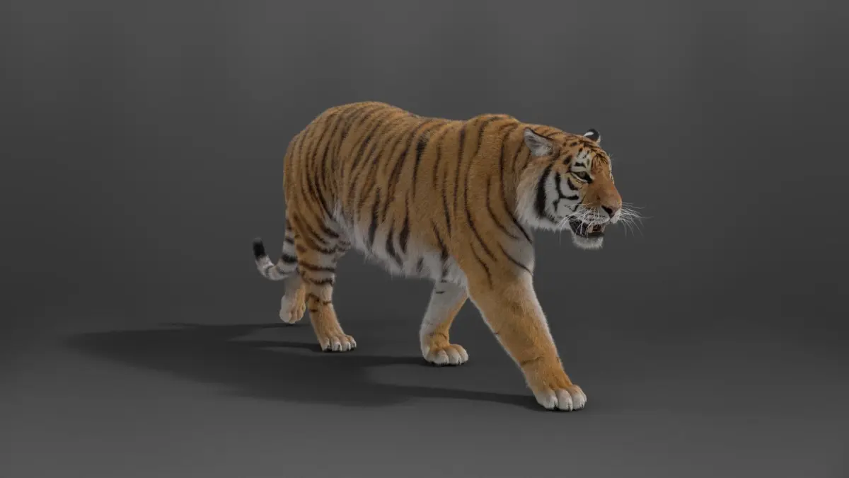 This Siberian tiger is modeled at real-world scale in Blender, with multiple 4K textures in UDIM format, fur, rigging, facial UI control.