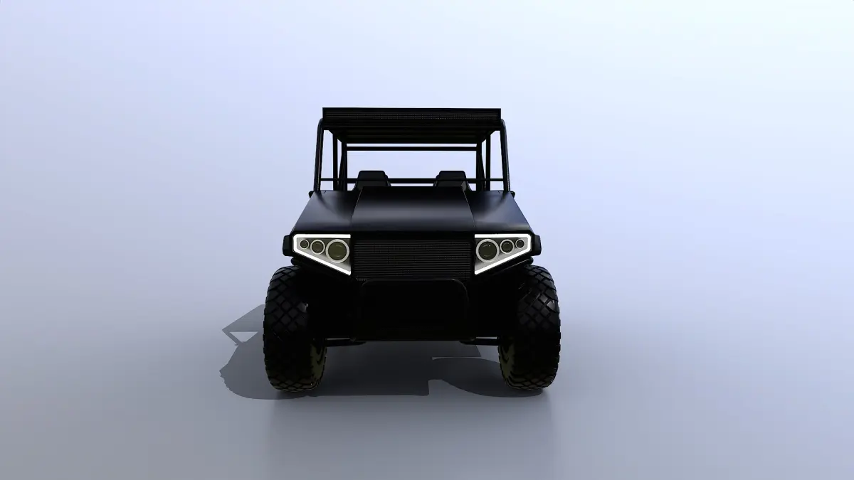 An off-road civilian side-by-side car in a matte black finish, featuring a boxy shape and durable design, ideal for exploring rough terrains in the present day.