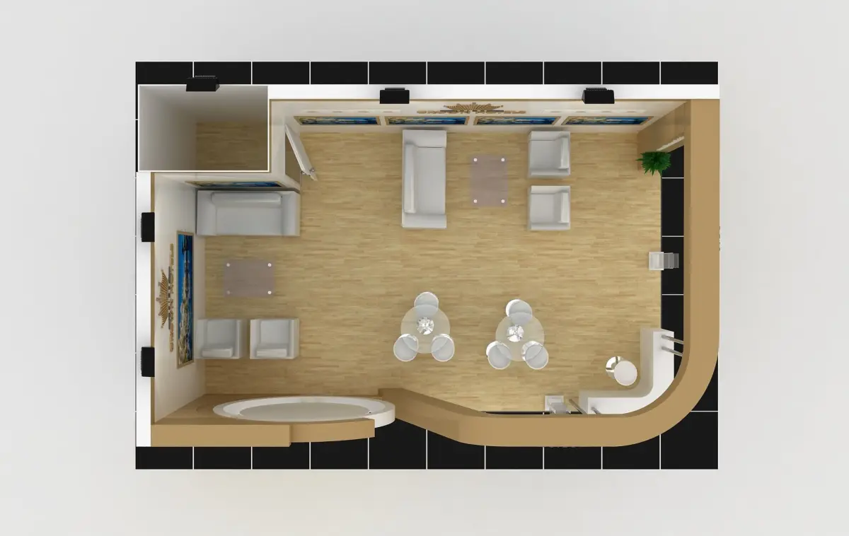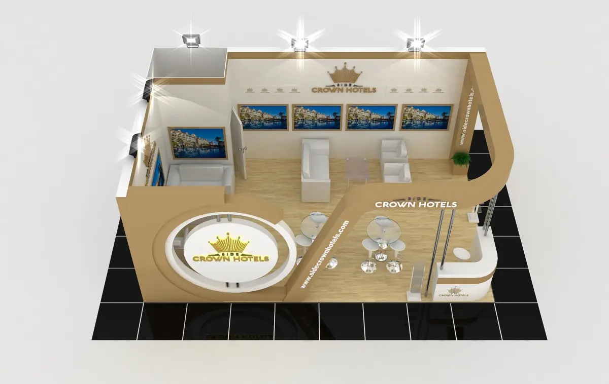 Stall Size 8 m x 5 m Height 350 cm - 2 Side open- Store- Reception table- TV