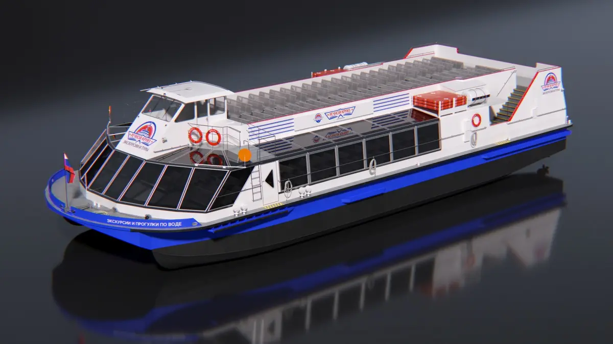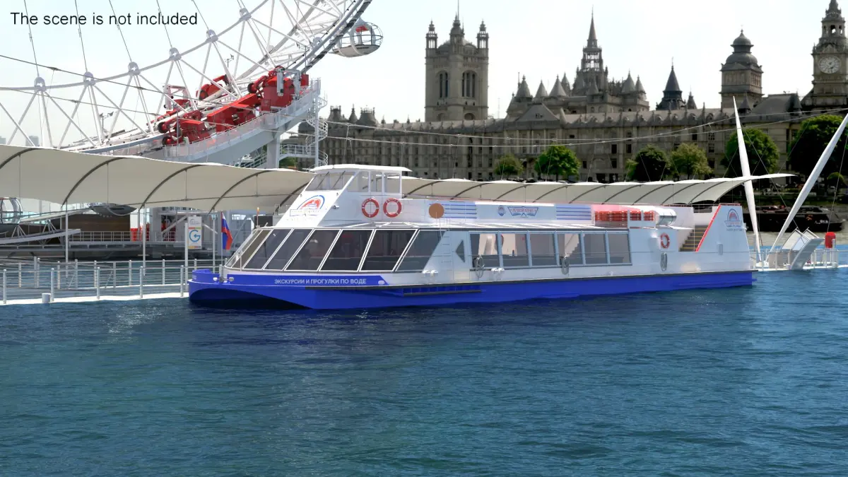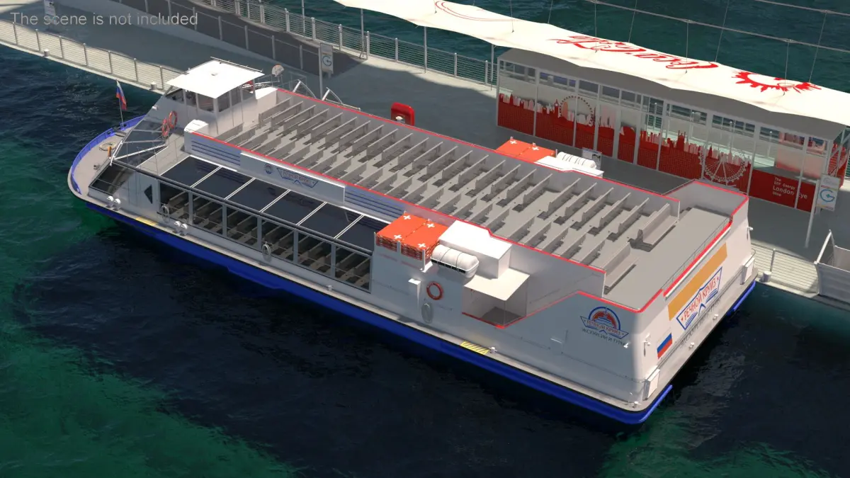 Sightseeing Boat Floating on Water is a three-dimensional model of Russian river sightseeing cruise boat, that is designed for scenic river cruises and commuter transport along urban waterways.