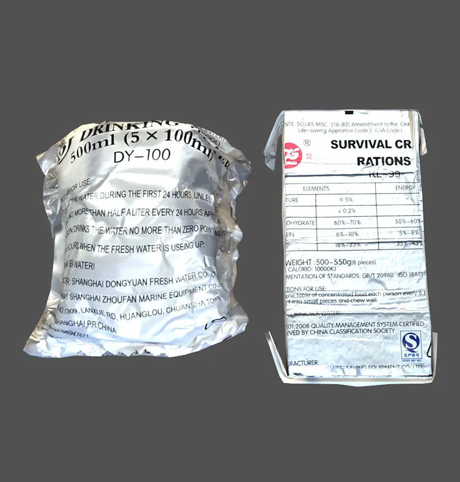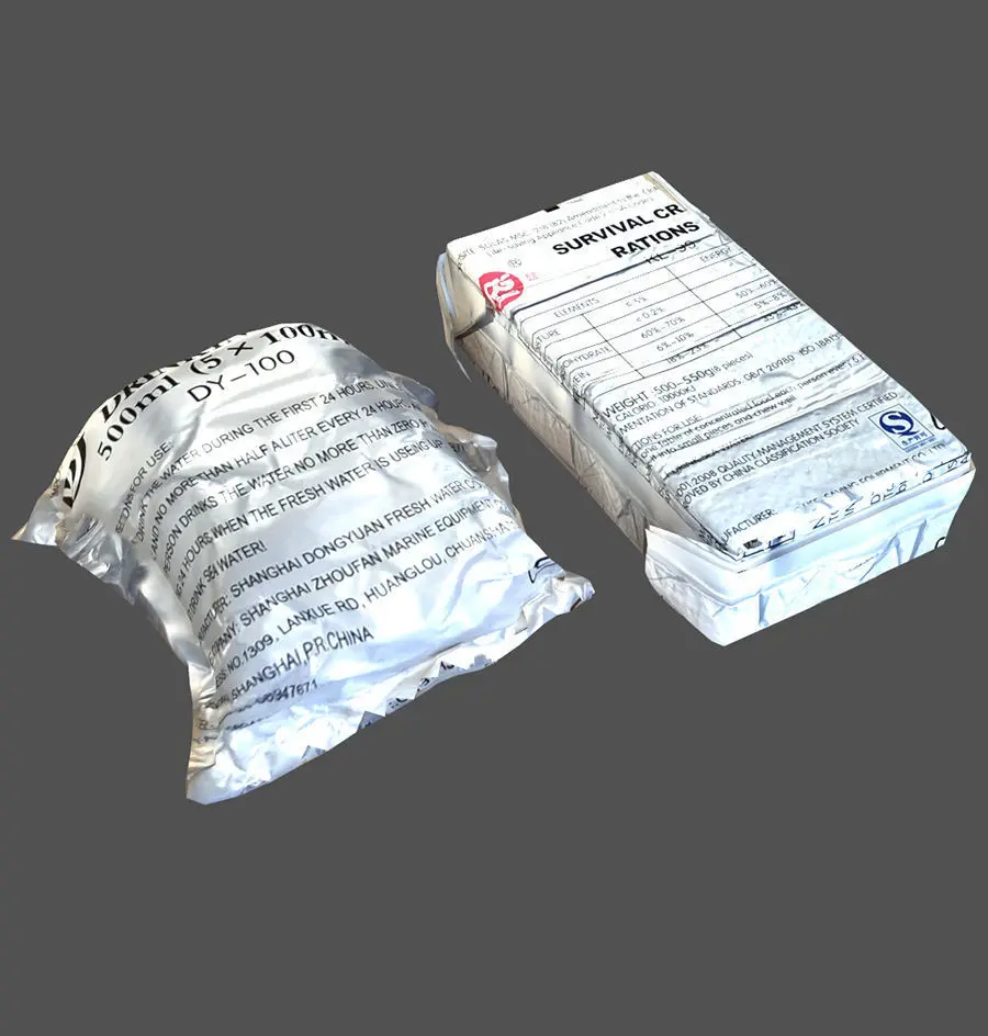 A set of signal flares, smoke bombs, flashlight, dry ration, first aid kit, blanket, sos antenna