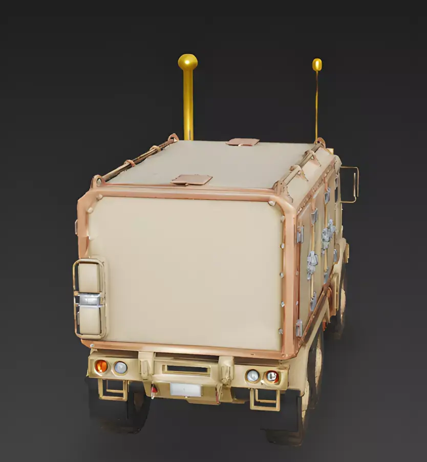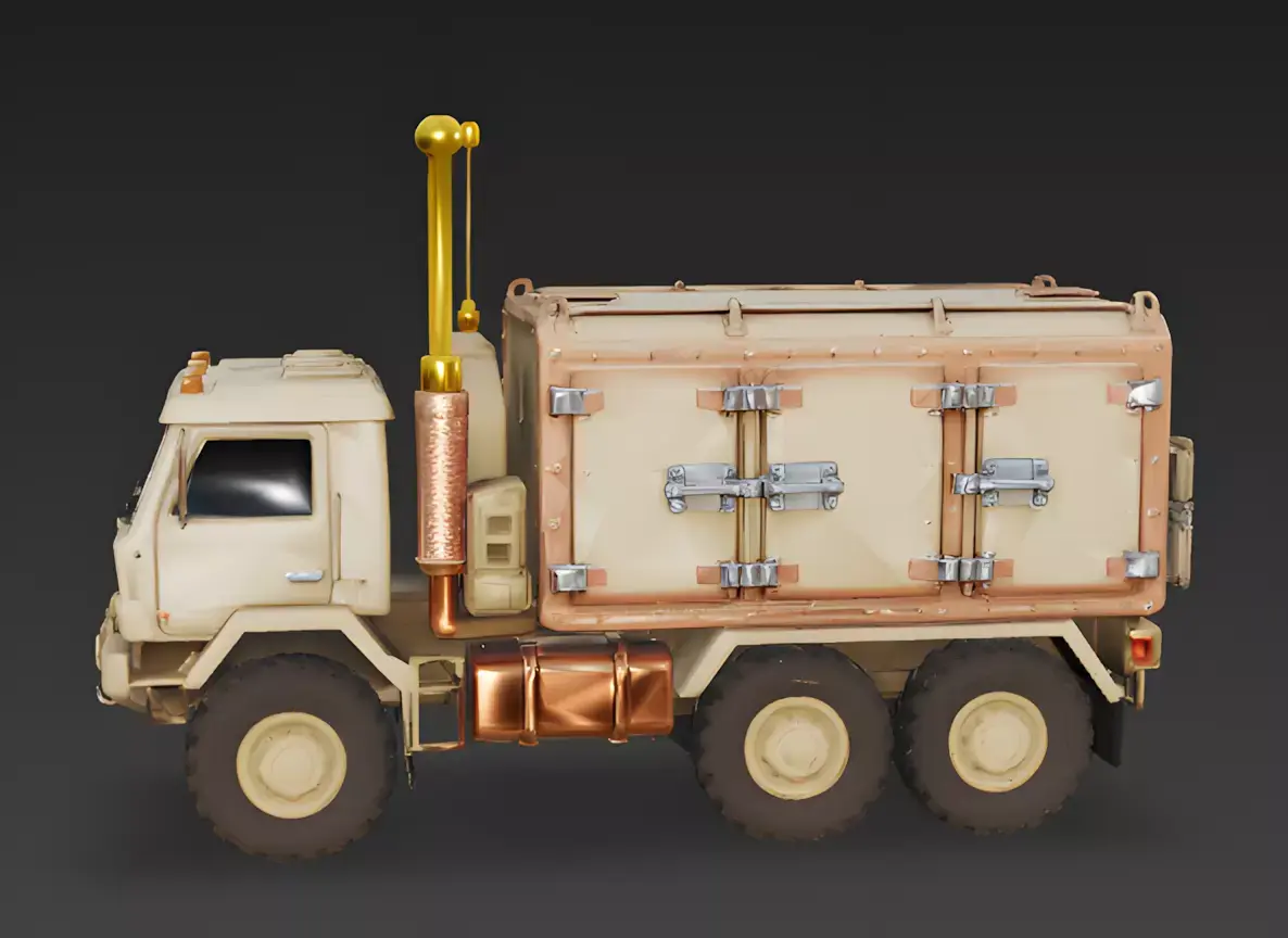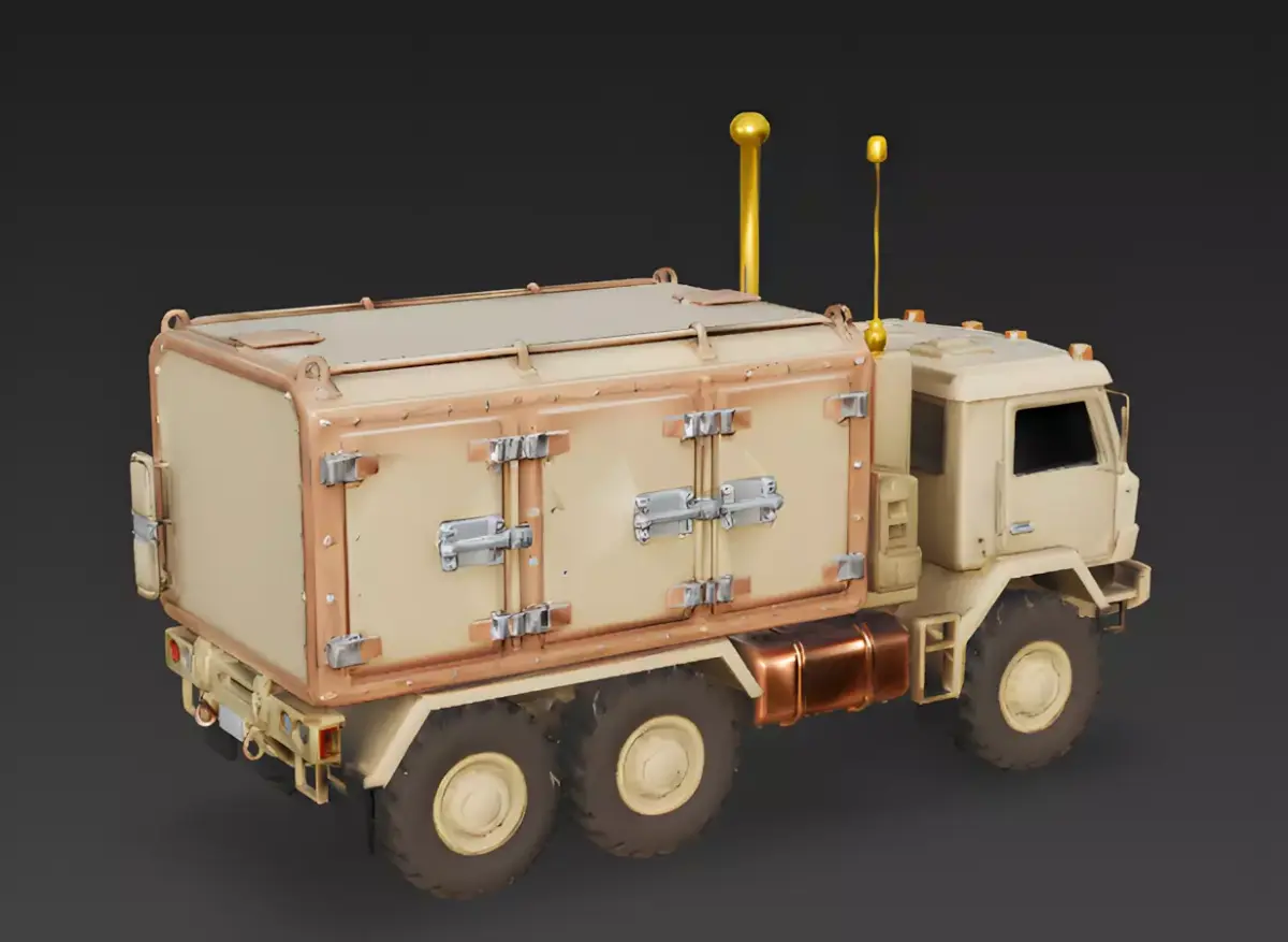 Reinforced Cargo ShelterThe rear of the truck features a massive, box-shaped communications shelter. The exterior is detailed with heavy-duty copper-colored rivets and multiple silver latch-locks, giving the impression of a secure, weather-proof environment for sensitive electronic equipment.