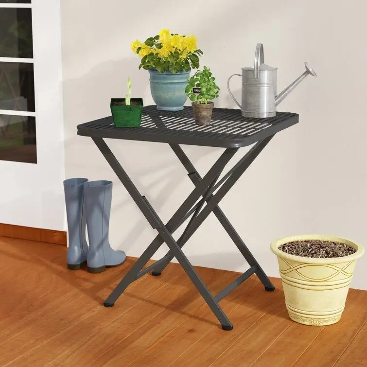 - This Signe Contemporary Folding Iron Bistro Table folds for easy carry and storage. Perfect for indoor and outdoor use, and designed with a thick powder-coated outdoor and UV light fading layer of protection.