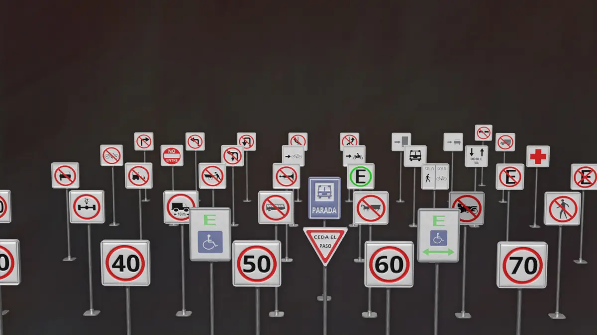 A collection of road signs, including regulatory, In Spanish context.