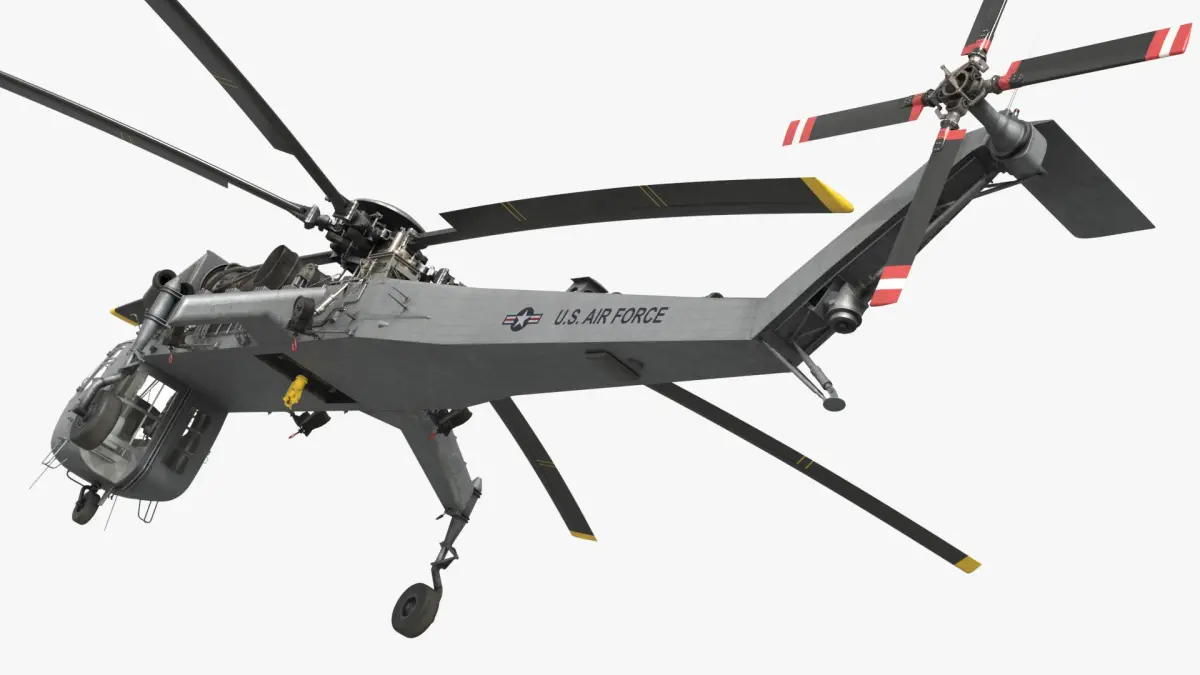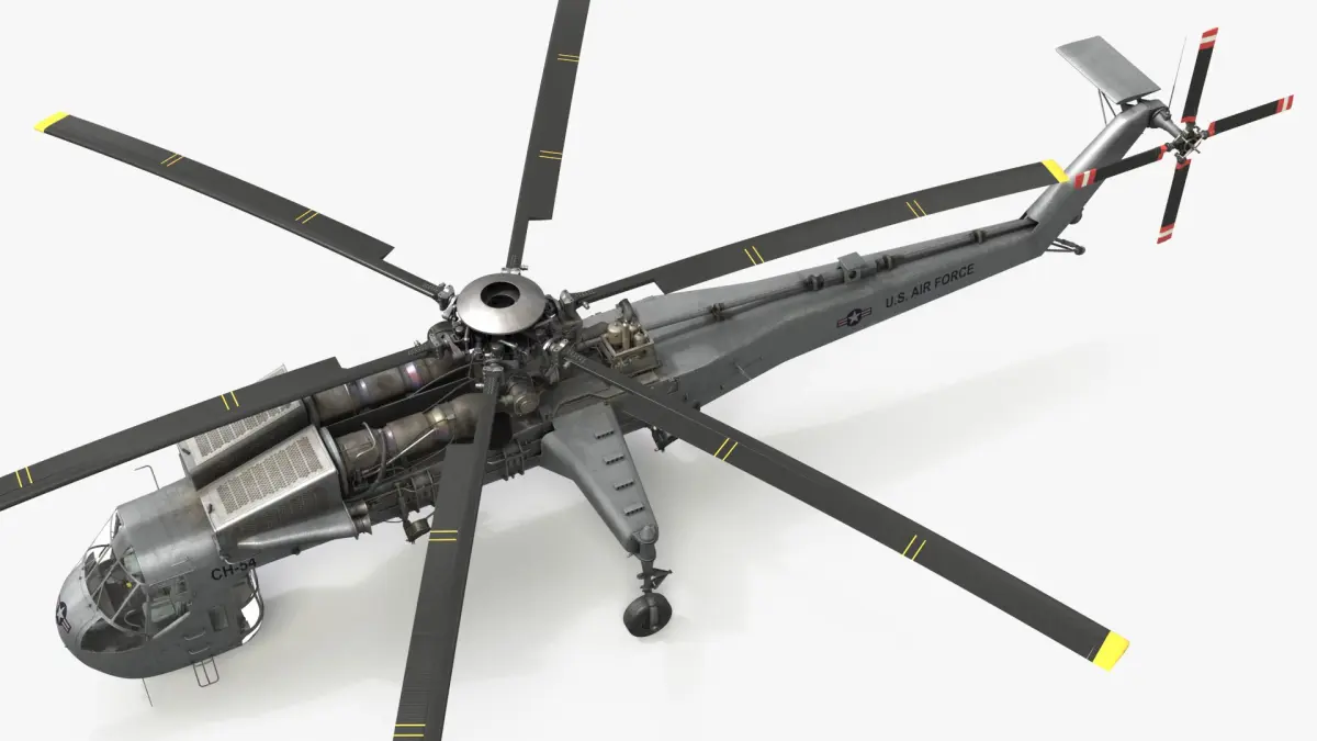 This model accurately represents the CH-54 with its distinctive crane-like design, featuring elongated landing gear and a powerful rotor system. It includes detailed elements such as cockpit controls, engine components, and the overall structure, making it ideal for detailed visualizations.