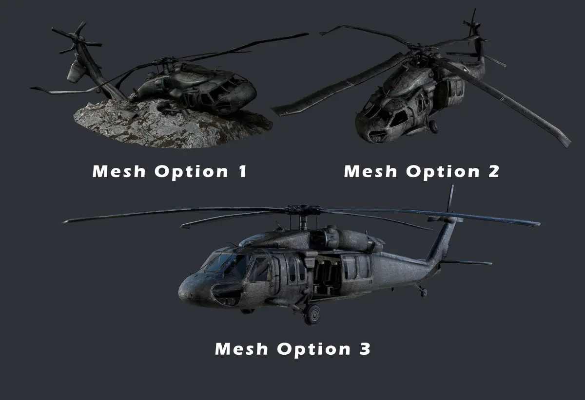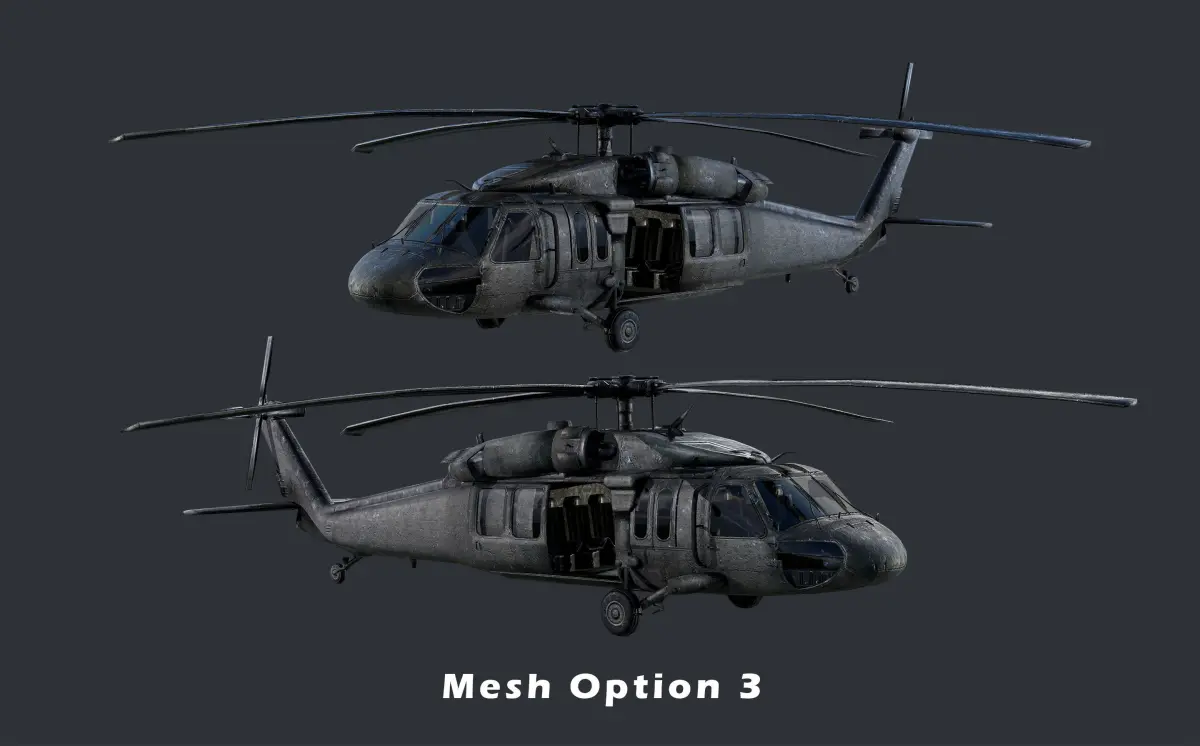 3 Models of a Sikorsky UH60 Black Hawk Helicopter, optimized for use in game engines. Unwrapped with PBR textures. OBJ files and FBX files. Ready for use in any 3D software or game engine. Unwrapped: Non- Overlapping