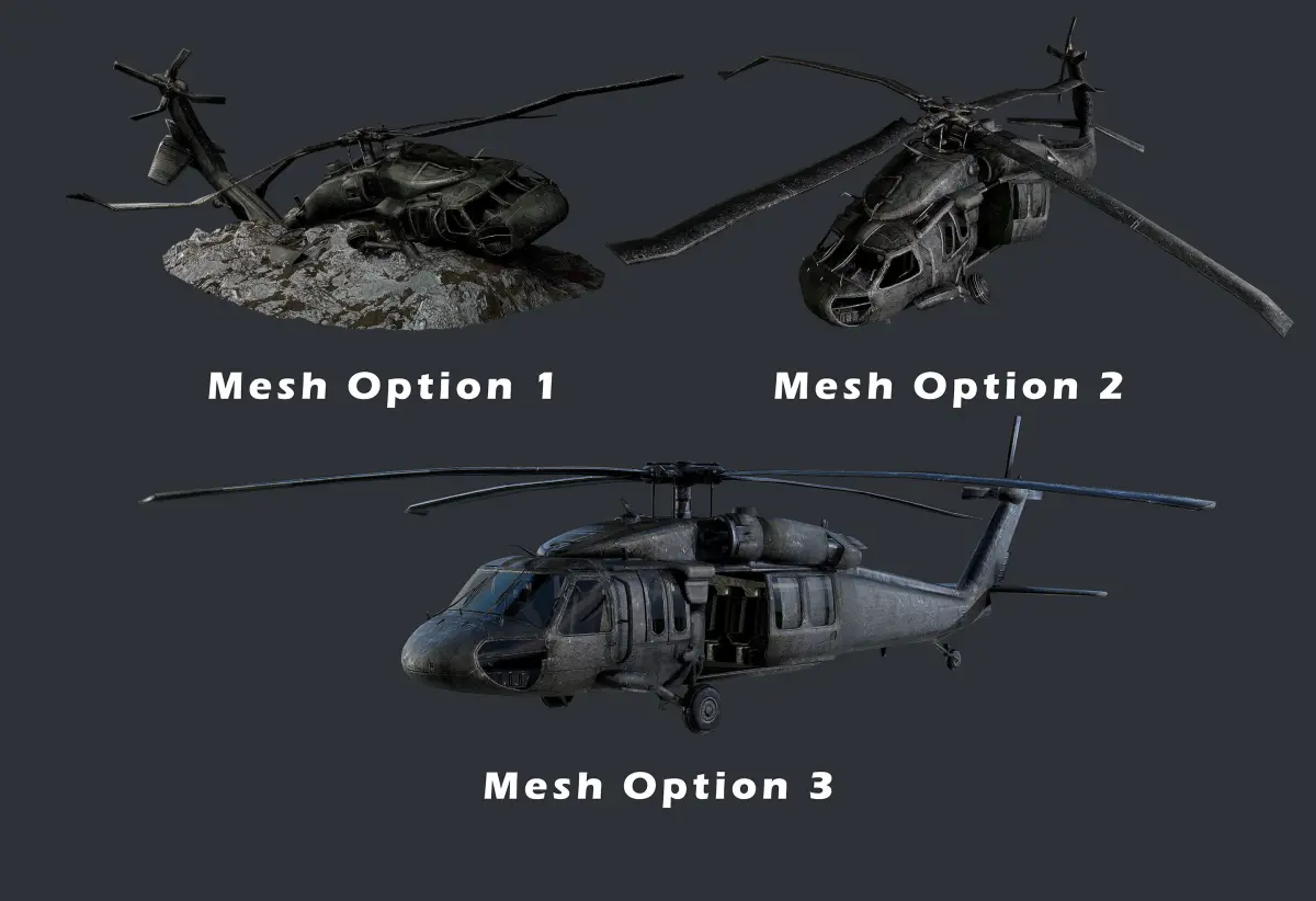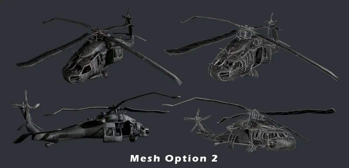 3 Models of a Sikorsky UH60 Black Hawk Helicopter, optimized for use in game engines. Unwrapped with PBR textures. OBJ files and FBX files. Ready for use in any 3D software or game engine. Unwrapped: Non- Overlapping