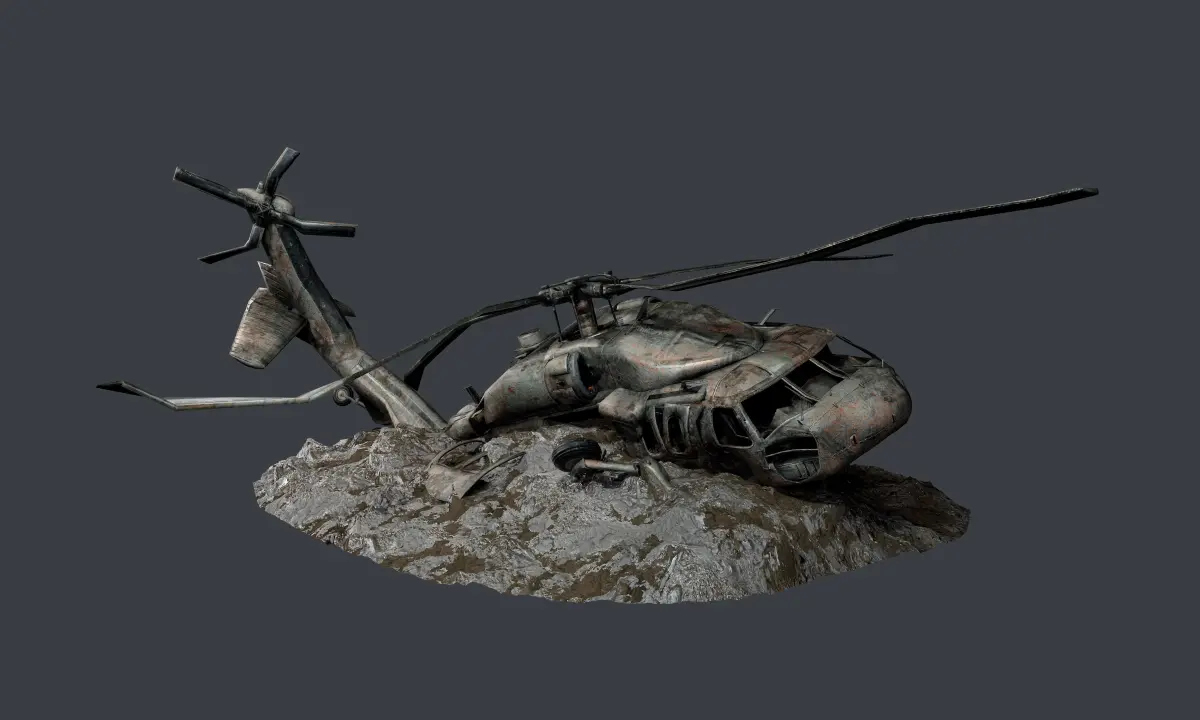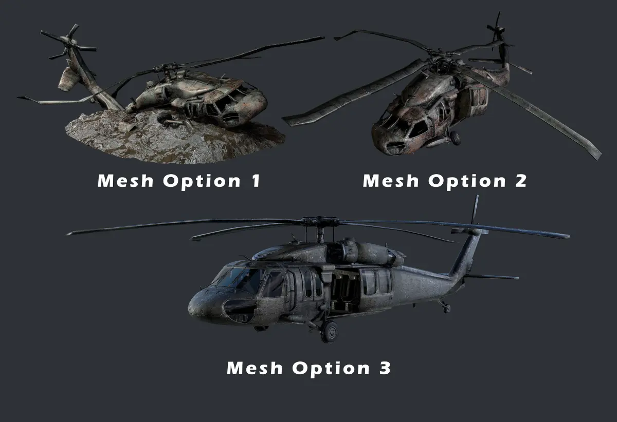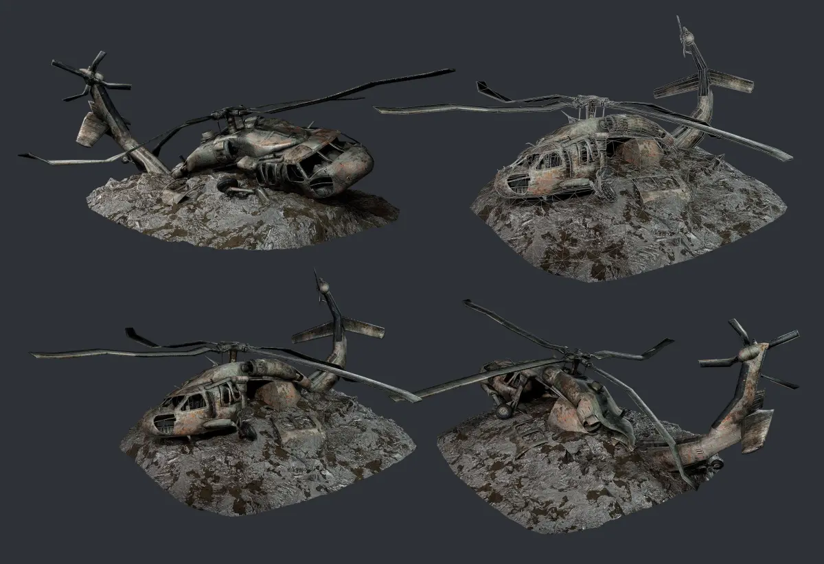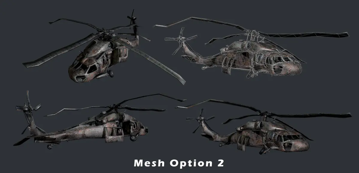 3 Models of a Sikorsky UH60 Black Hawk Helicopter, optimized for use in game engines. Unwrapped with PBR textures. OBJ files and FBX files. Ready for use in any 3D software or game engine. Unwrapped: Non- Overlapping