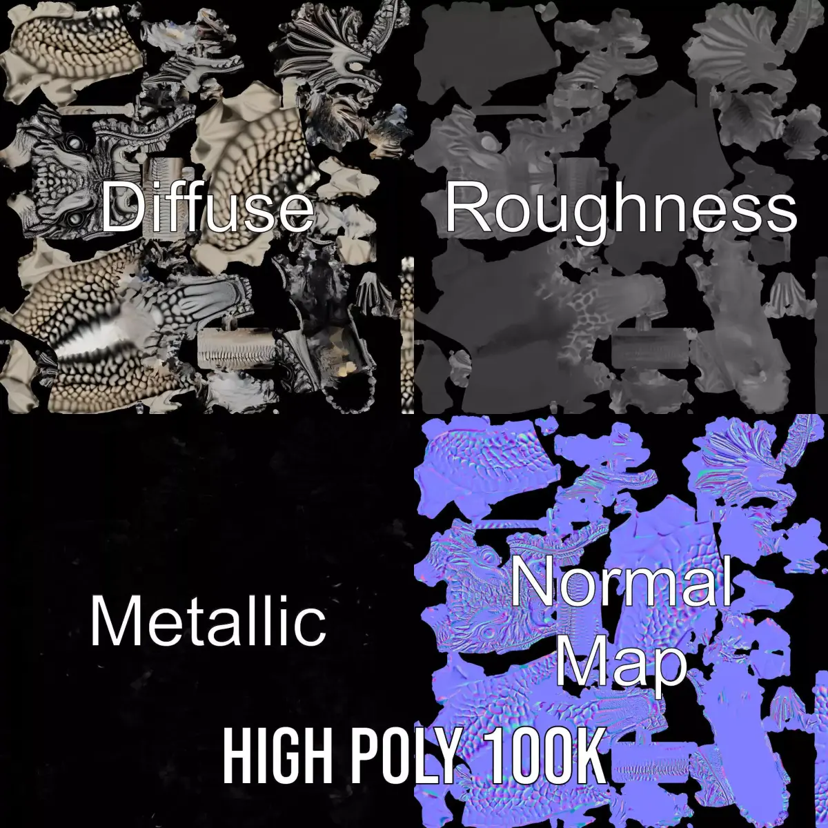 The Silver Dragon Sculpture model pack features a striking 3D representation of a majestic dragon head, intricately detailed with scales and sharp features. Ideal for use in fantasy-themed games, cinematic animations, or 3D printing projects, this model is a showpiece of dragon artistry. Each model has 3 levels of detail: low-poly (1000 triangles for mobile), middle-poly (10,000 triangles for environment), and high-poly (100,000 triangles), which allows for the use of this model in production rendering (such as 3ds Max, Maya, Cinema 4D, Blender, Vray/Corona/Cycles and all others), game engines (Unity and Unreal compatible), and interactive presentations, providing a choice of detail based on the LOD System principle. The model's textures are PBR, Diffuse, NormalMap, and reflection/roughness/metallic, which are suitable for any modern rendering engine. All models are accurately unwrapped and have no overlapping UV. All textures are 4096*4096 in size. If you enjoyed this model and found it useful, please like and leave a comment!