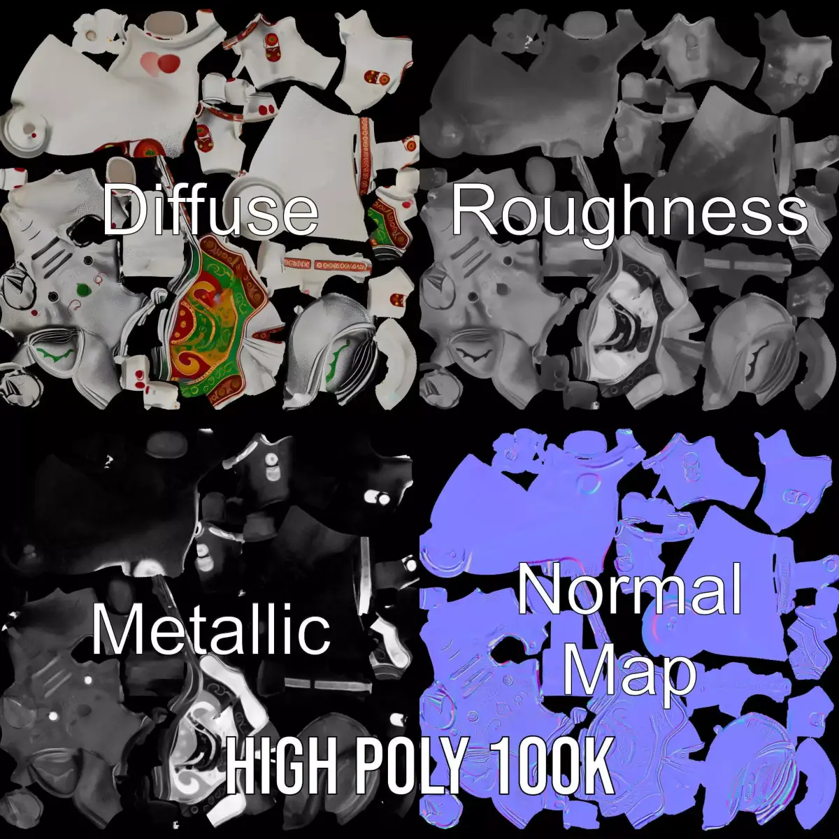 Introducing the Silver Elephant Decor model pack, a beautifully crafted 3D model featuring intricate patterns and vibrant colors. This model is perfect for use in animation projects, virtual reality experiences, and as a decorative element in architectural visualizations. Each model has 3 levels of detail: low-poly(1000 triangles for mobile), middle-poly(10,000 triangles for environment), and high-poly(100,000 triangles), which allows for the use of this model in production rendering(such as 3ds max, Maya,Cinema4d, Blender, Vray/Corona/Cycles and all other), game engines(Unity and Unreal compatible), and interactive presentations, providing a choice of detail based on the LOD System principle. The model's textures are PBR, Diffuse, NormalMap, and reflection/roughness/metallic, which are suitable for any modern rendering engine. All models accurately unwrapped and have no overlapping UV. The vibrant design makes it ideal for adding character and charm to any scene. Please like and leave a comment for the model if you enjoyed it. All textures are 4096*4096 in size.