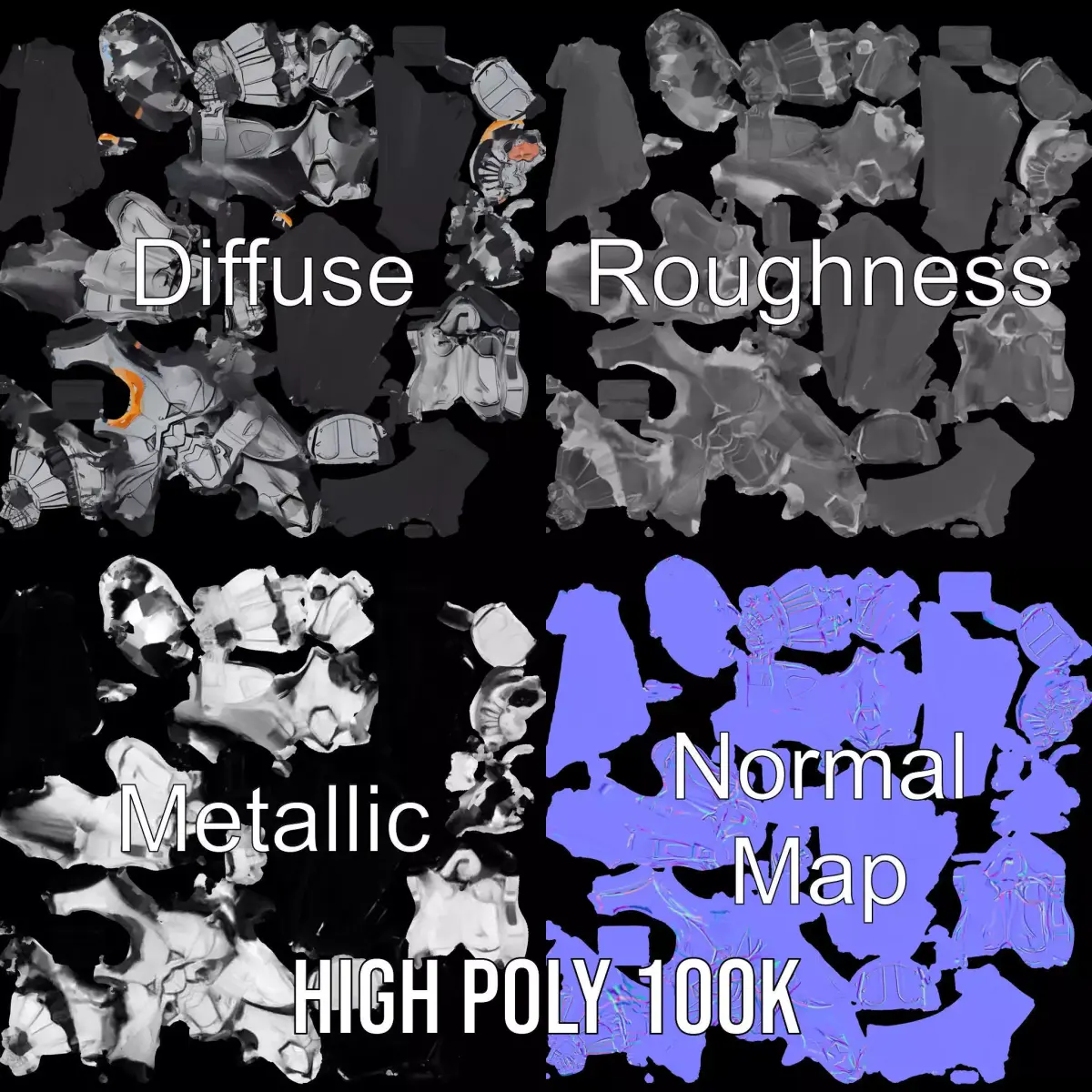 The Silver Knight Armor model pack features a meticulously crafted, futuristic suit of armor with sleek metallic surfaces and intricate detailing. Ideal for integrating into game environments, animation projects, and cinematic scenes, this model elevates your visuals with its striking appearance and versatility. Each model has 3 levels of detail: low-poly (1000 triangles for mobile), middle-poly (10,000 triangles for environment), and high-poly (100,000 triangles), which allows for the use of this model in production rendering (such as 3ds Max, Maya, Cinema 4D, Blender, V-Ray/Corona/Cycles), game engines (Unity and Unreal compatible), and interactive presentations, providing a choice of detail based on the LOD System principle. The model's textures are PBR, Diffuse, NormalMap, and reflection/roughness/metallic, which are suitable for any modern rendering engine. All models accurately unwrapped and have no overlapping UVs. All textures are 4096*4096 in size. If you like this model, please give it a like and leave a comment!