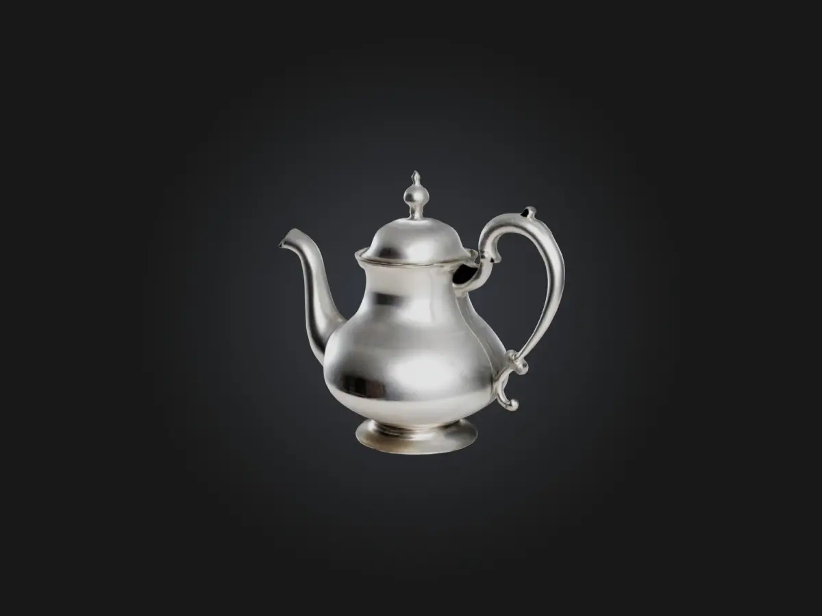 [Modelo 3D de alta calidad de una tetera plateada, perfecto para renderizado, animación y desarrollo de juegos.] Formatos de archivo disponibles: FBX, OBJ, STL, GLB, USDZ, BLEND.