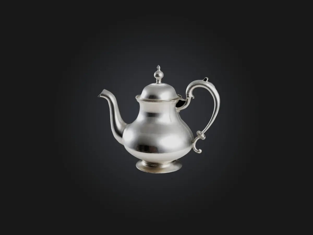 [Modelo 3D de alta qualidade de um bule de chá prateado, perfeito para renderização, animação e desenvolvimento de jogos.] Formatos de arquivo disponíveis: FBX, OBJ, STL, GLB, USDZ, BLEND.