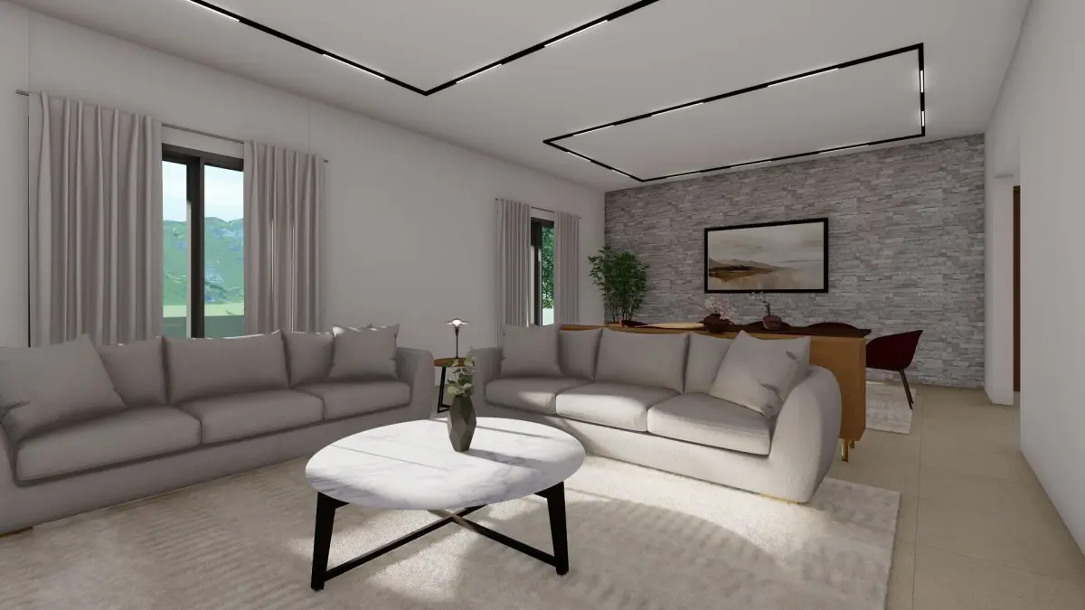 The contemporary kitchen is fully equipped with detailed cabinetry, high-end appliances, and a functional island workspace, combining modern practicality with visual appeal. The master bedroom suite includes expansive windows, a dedicated work desk, and minimalist furniture, creating a serene and comfortable environment. Each space is modeled with precision, from textures and materials to lighting balance, ensuring both aesthetic and technical accuracy.