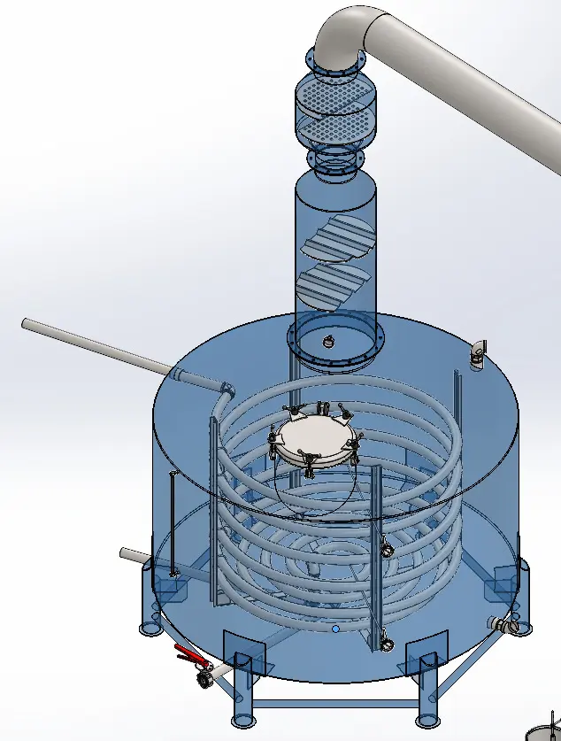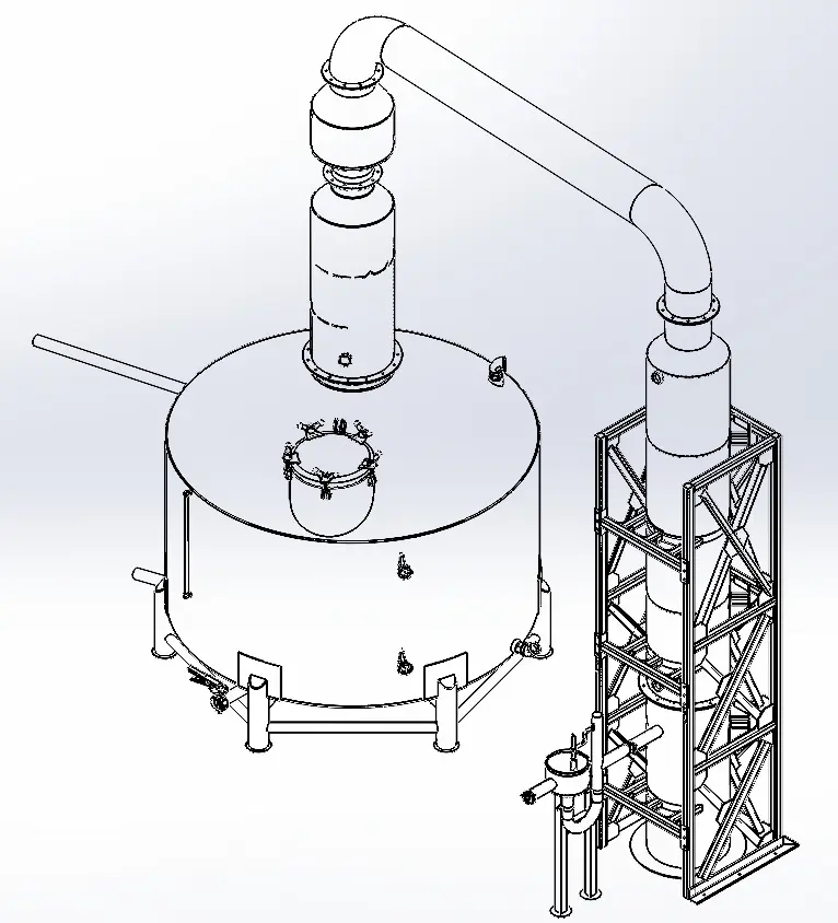 This simple distillation system is designed to separate liquid mixtures based on differences in boiling points. It consists of a stainless steel boiler, a condenser with water inlet and outlet, and a collection vessel. With a capacity of 5,000 liters (approximately 1,320 gallons), it is ideal for small to medium-scale purification processes, ensuring efficient heat transfer and easy operation.