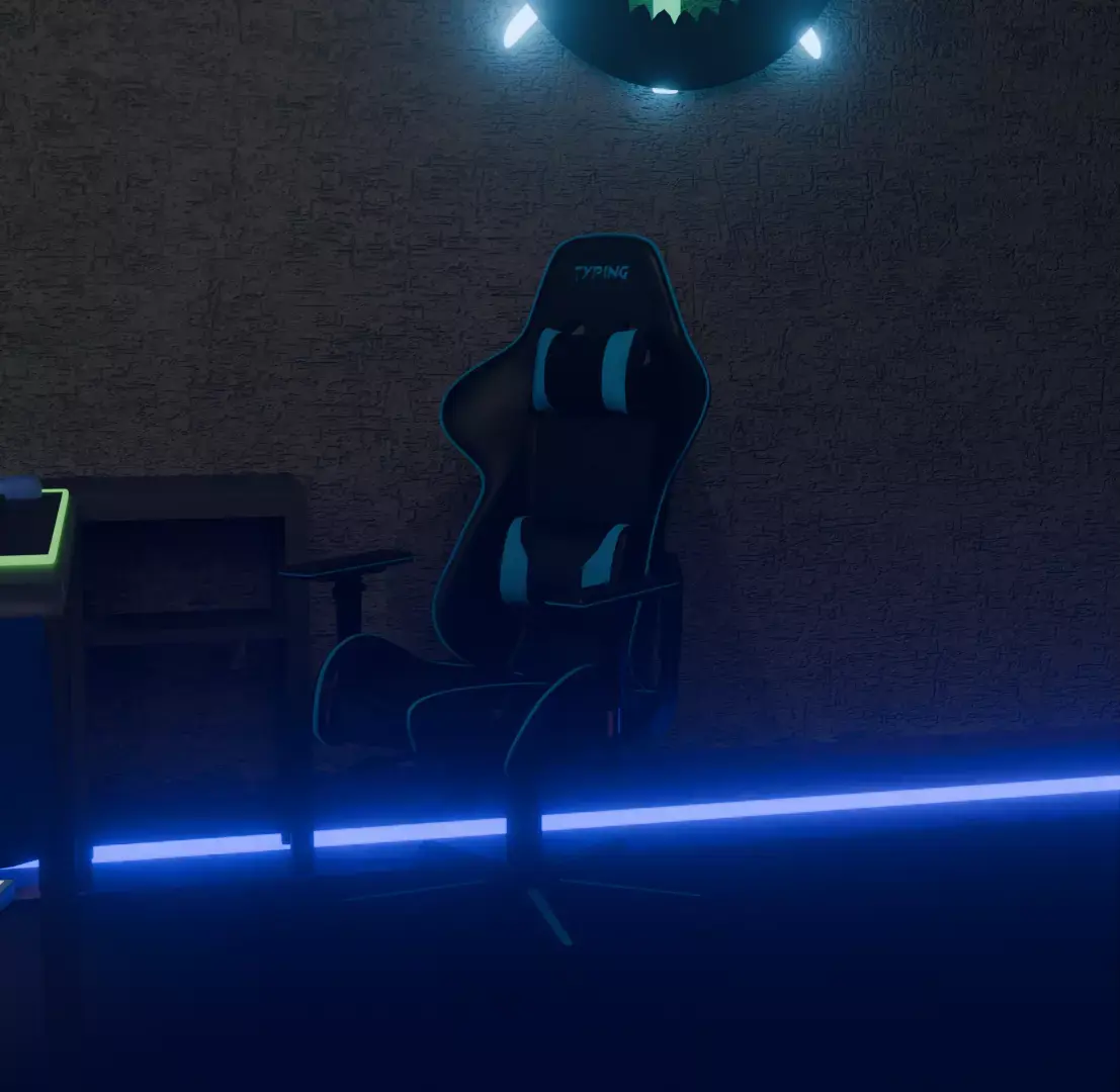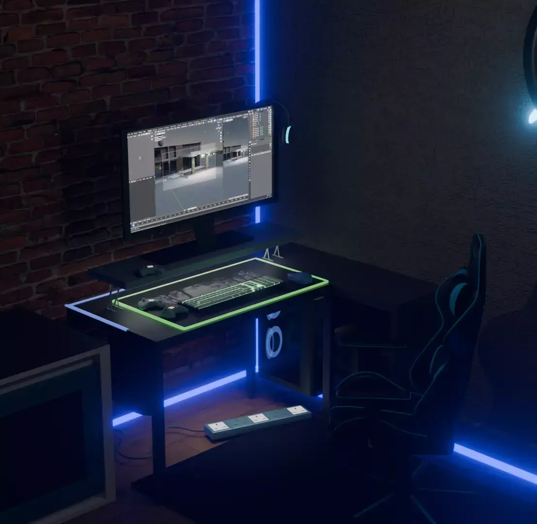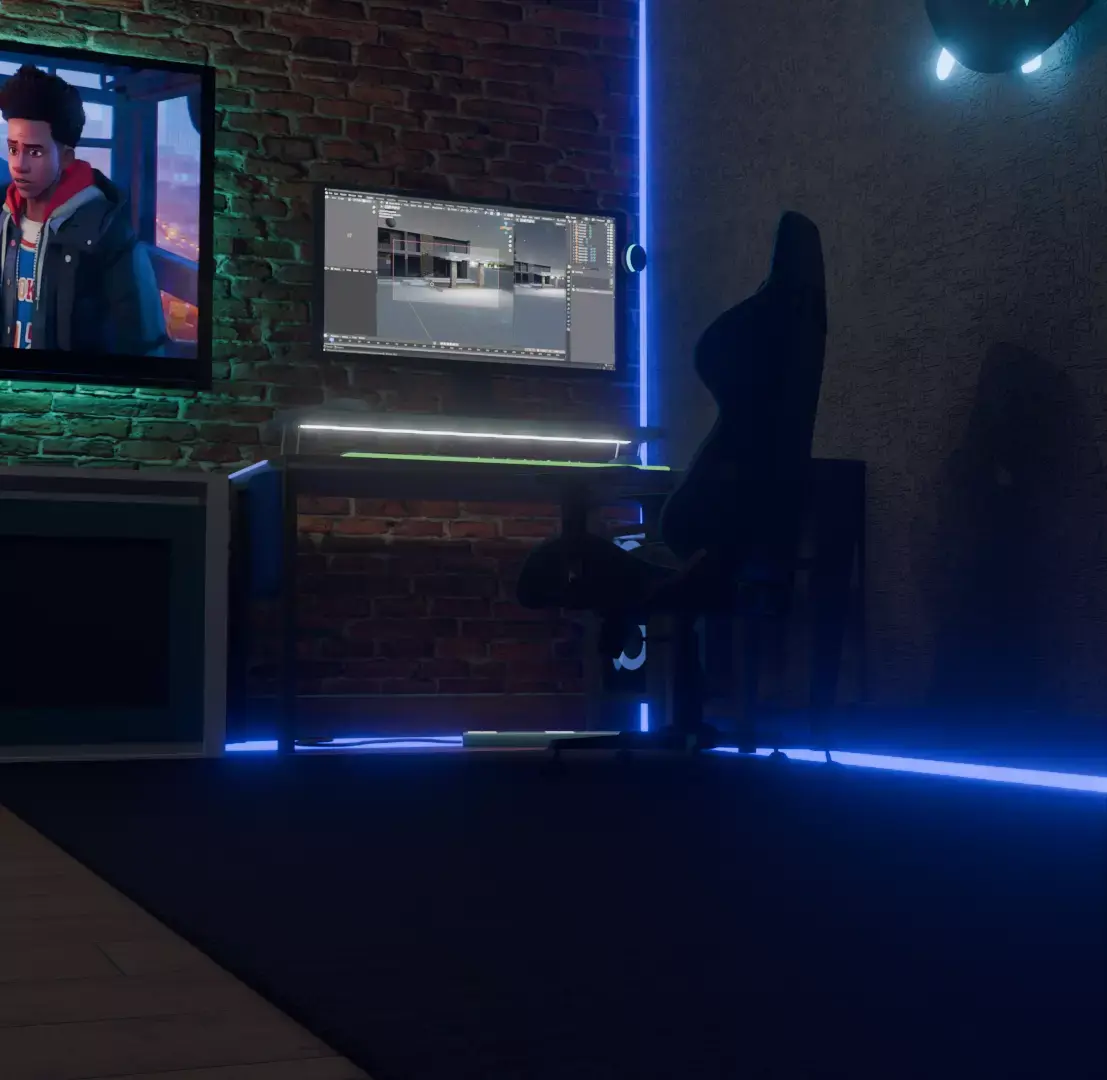 This scene represents a modern gamer / creator room, designed to feel immersive, cozy, and premium.