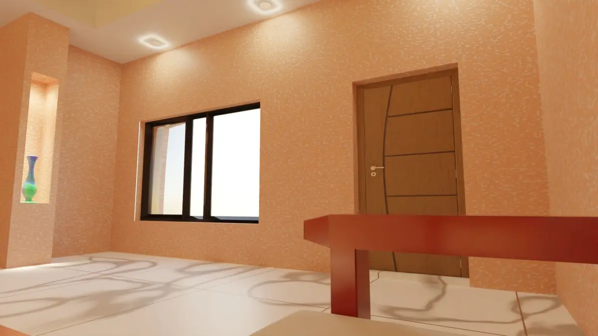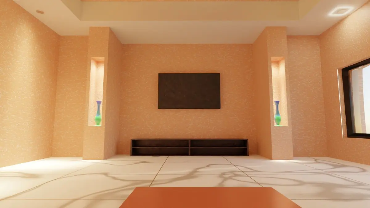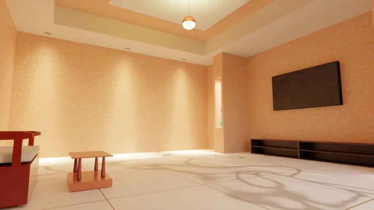 The model is done in blender 2.91 and rendered in Cycles.The model shows the simple living room interior.The room is provided with a simple dual wooden sofa with cushion.In front of the sofa a coffee table is placed.Opposite to sofa a black LCD screen TV is wall mounted and a wooden cabinet is placed below the TV.On either side of the TV, a blue coloued flower vase is placed inside the wall inlet which is illuminated by the spot light. The Spot light is IES light (the IES file is not attached, you cab download your own IES light files from internet).The left side of the sofa is provided with IES spot light while the right side is provided with Area lighting.the hall has a globe light at the center of the ceiling.The room is provided with a door and glass window which passes the sun light from out side.Vertices-30857Faces-28948Edges-59859
