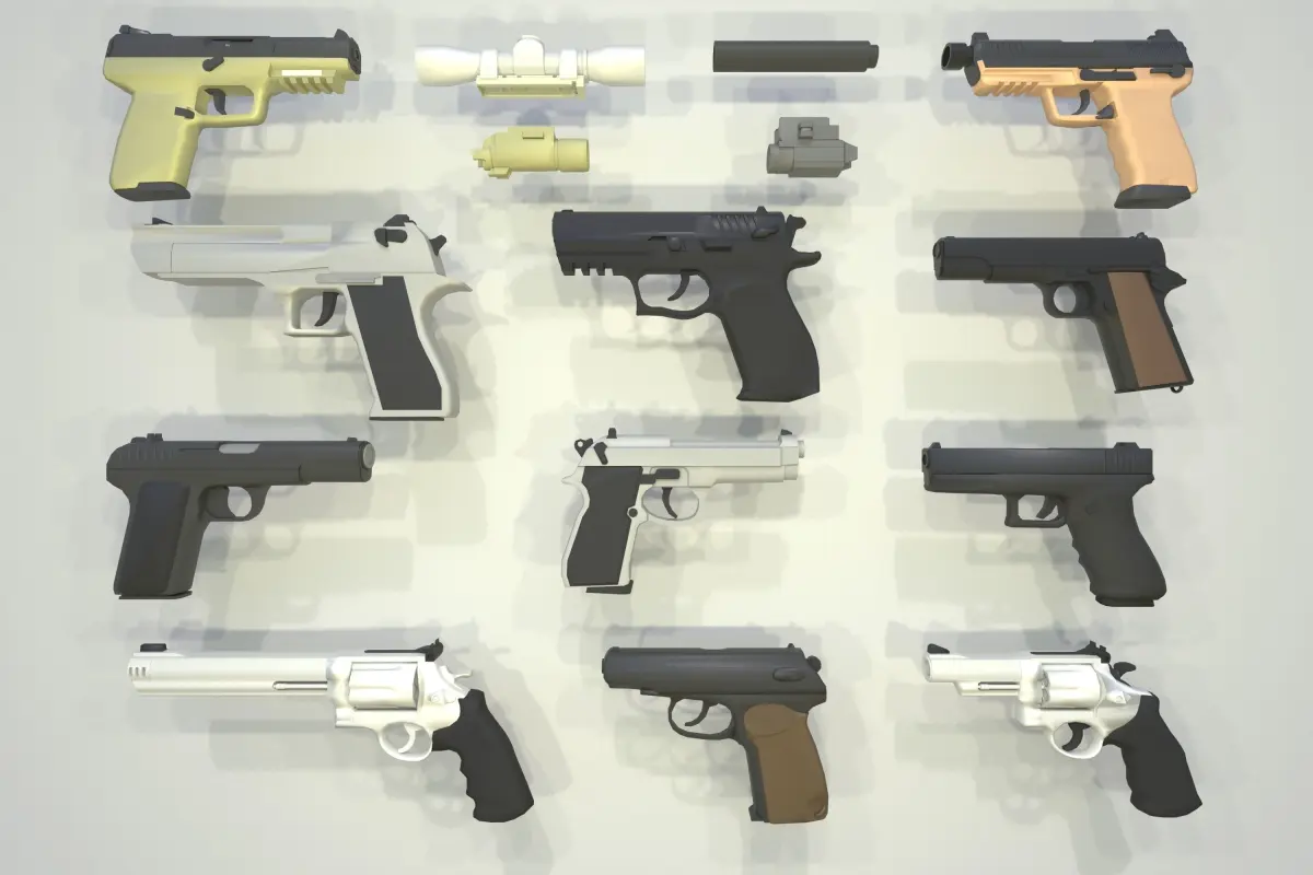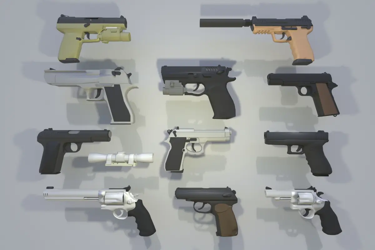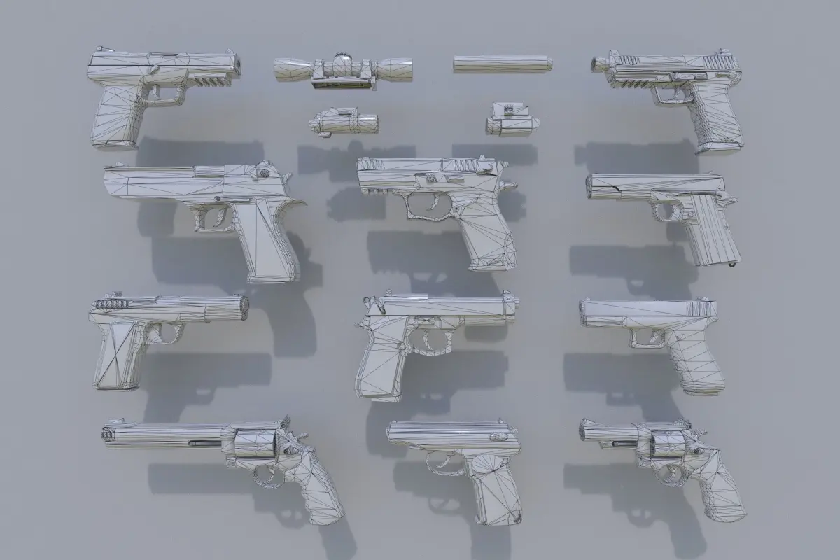 This file contains 10 pistols, 2 Under barrel Flashlight, Dumper for HK45, Optical sight with mount for Smith & Wesson-460XVR: