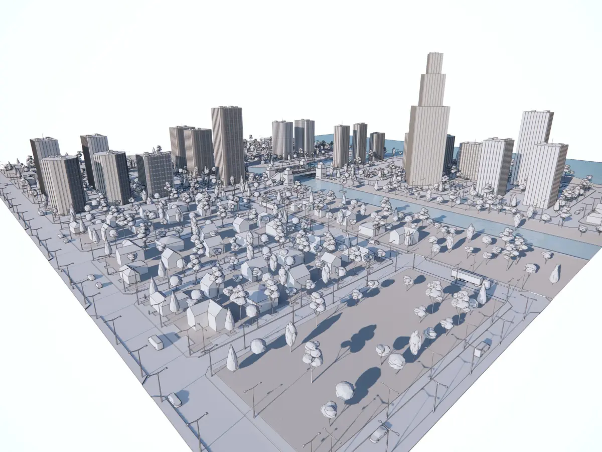 This is a simple urban model. Represents downtown of Chicago. It includes buildings, roads, cars, trees, water areas. All models in this package are well optimized.