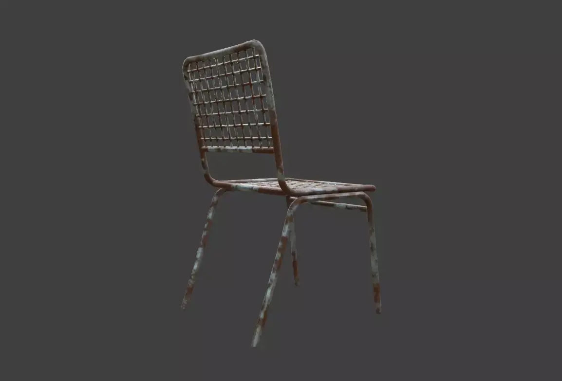 Visually, the chair features a clean, readable silhouette defined by its grid-pattern seat and backrest. The mesh geometry communicates lightness and practicality, while the corroded metal surface introduces history and character. Rust accumulation, discoloration, and subtle surface pitting suggest years of weathering, moisture exposure, and neglect. These details elevate the model from a simple prop to an environmental storytelling element that quietly reinforces realism and atmosphere.