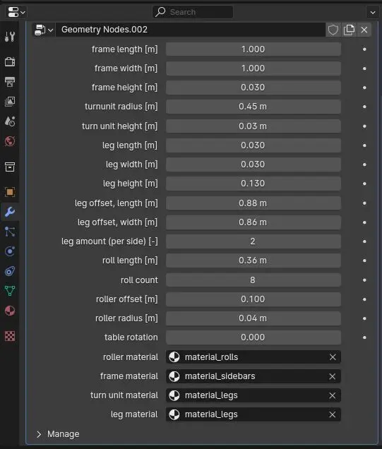 Geometry node in blender that represents simple parametrized turnable conveyor turn unit, with parametrized: