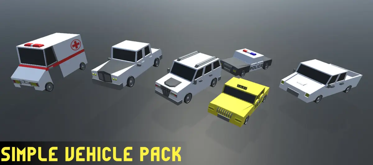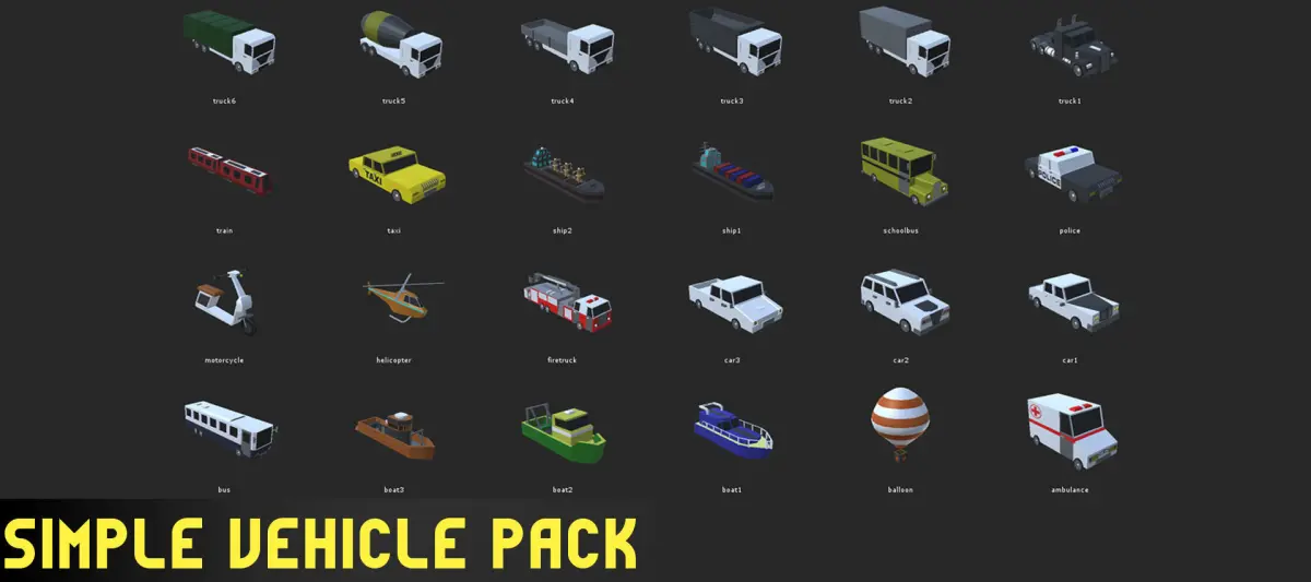 Simple cars, trucks, ships and other vehicles.24 simple model included in demo scene to using in your game.Mobile friendly low poly draws.6 x Trucks3 x Cars3 x Boats2 x ShipsTaxiPolice CarAmbulanceBalloonBusSchool BusHelicopterFire TruckTrainMotorcycle