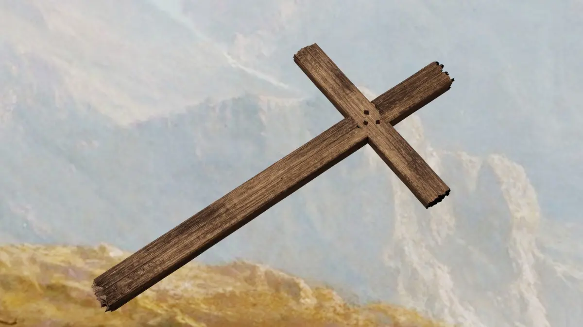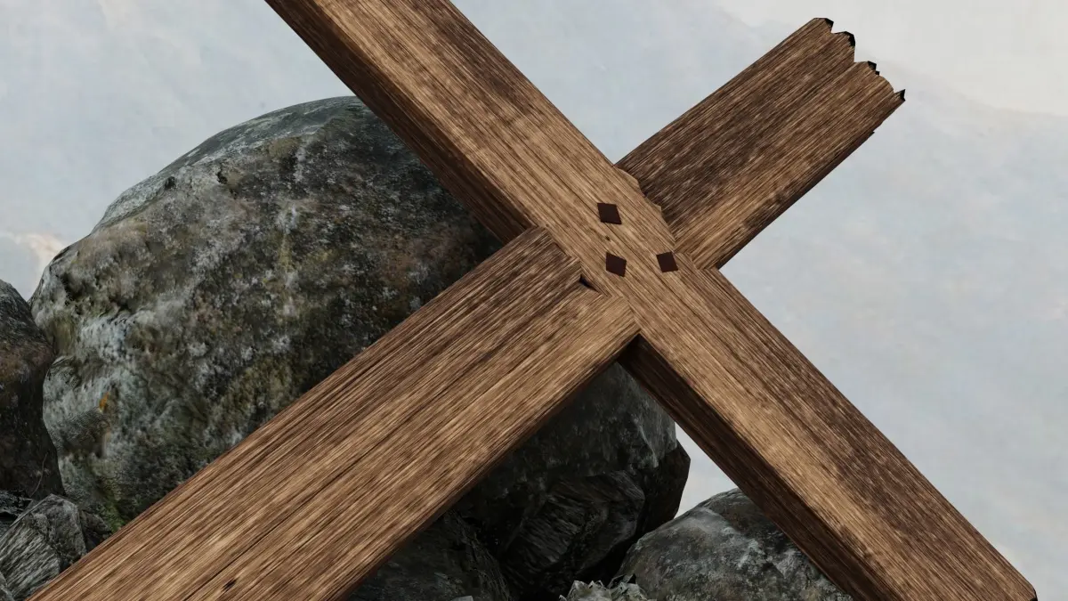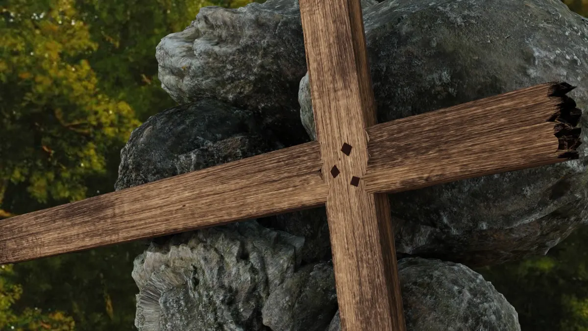 A simple wooden cross of Jesus Christ with nails on top of a few boulders.