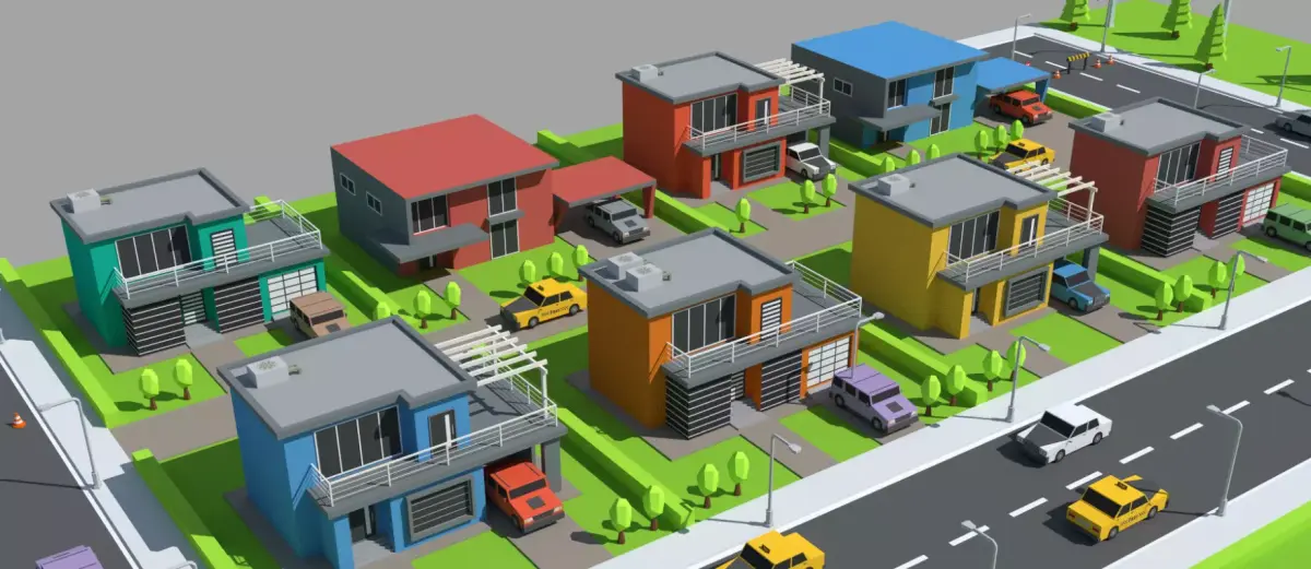 Buildings - Auto service, Bakery, Bar, Books shop, Chicken shop, Clothing, Drug store, Factory, Fast Food, Fruits shop, Gas station, Gift shop, Sky building small and big with color variations, Music store, Pizza, residential building with color variations, shoes shop, Stadium, super market and four type of Modern Houses with three type of texture variations for each model.