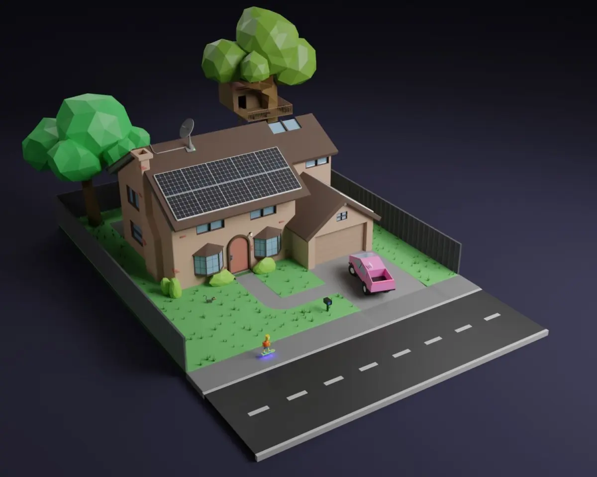 Low poly model of the house from the tv series The Simpsons. A secondary model is also provided that contains a more futuristic vibe to it. Character models are not provided. Originally model with Blender 2.9 and rendered with Cycles.