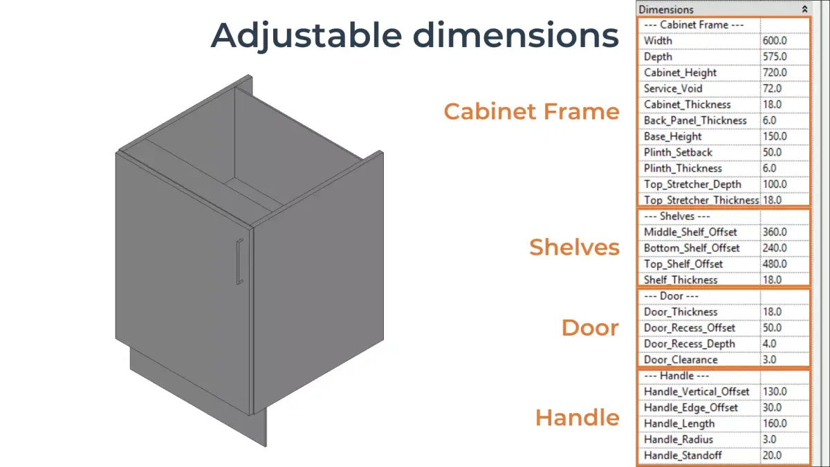 - Adjustable dimensions for cabinet frame, door, shelves, and handle