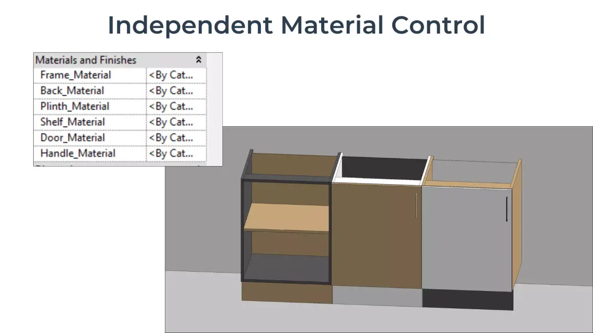 - Editable materials for cabinet frame (incl. top stretcher), back panel, plinth, shelf, door front, and handle