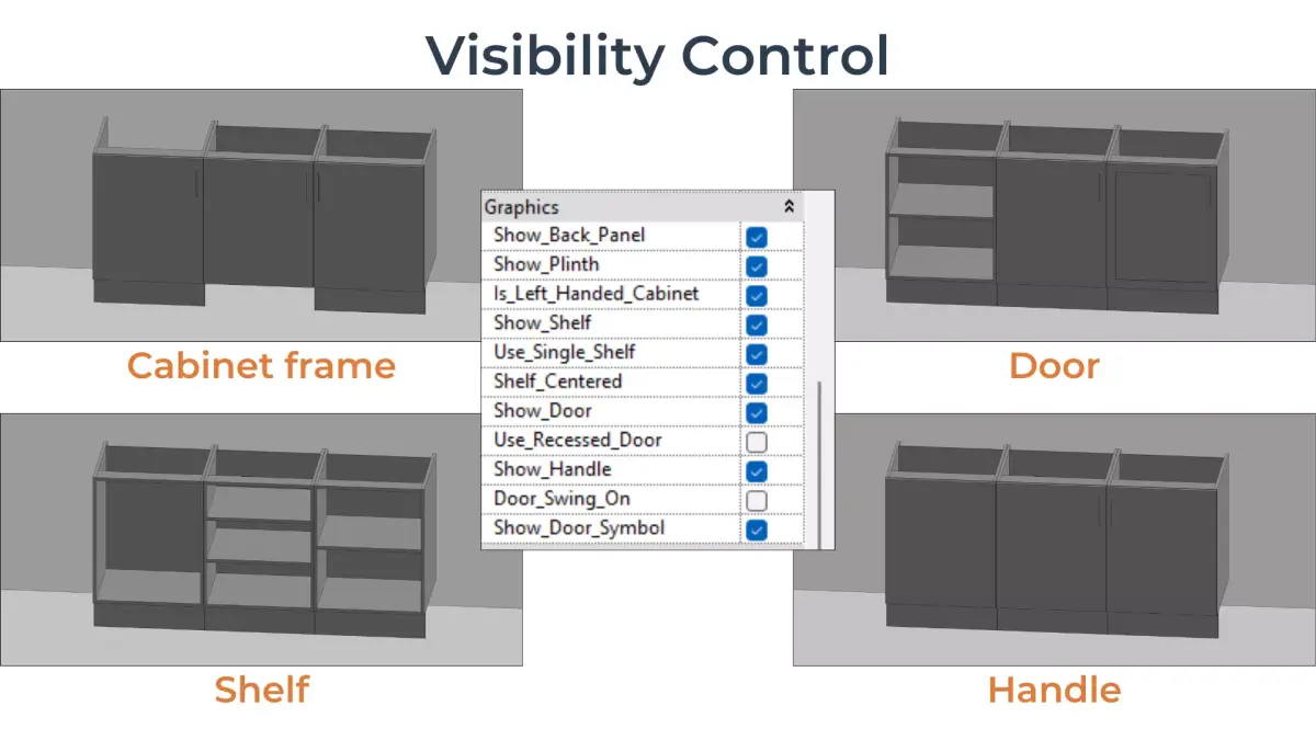 - Independent visibility for swing arcs and door side indicators. Based on the cabinet orientation, the correct left or right symbols will be shown automatically.