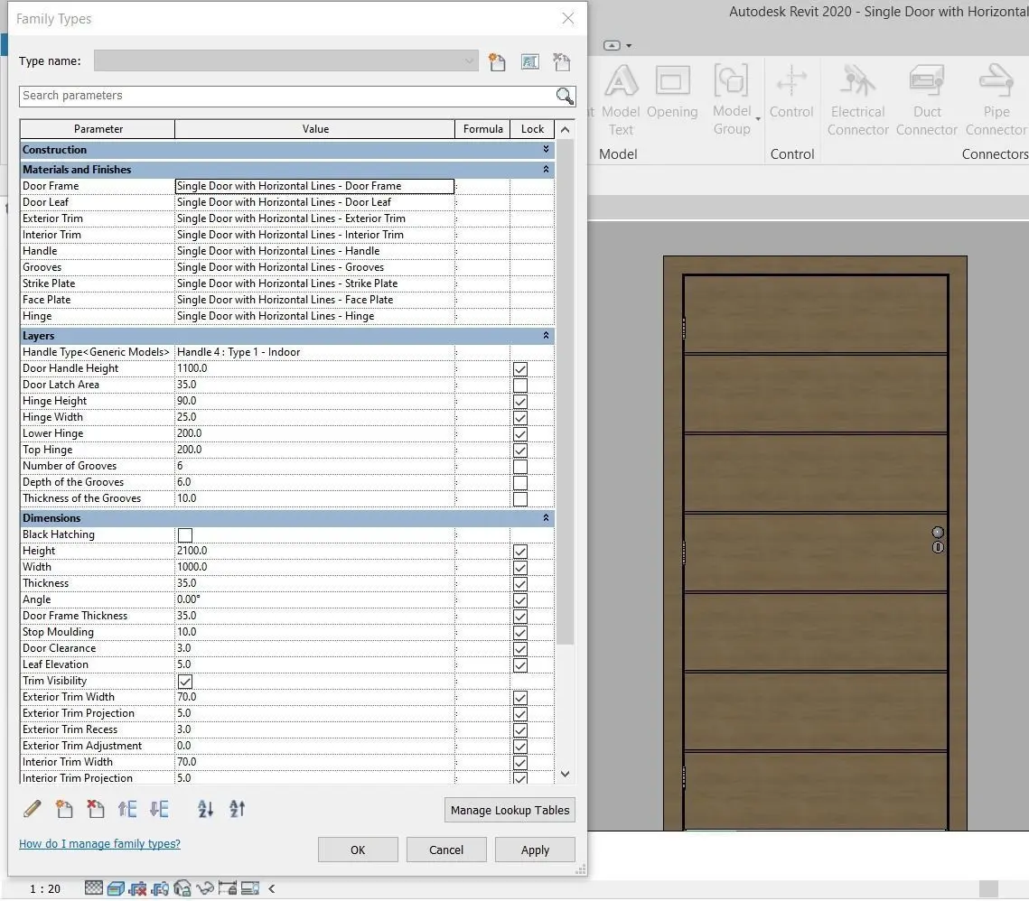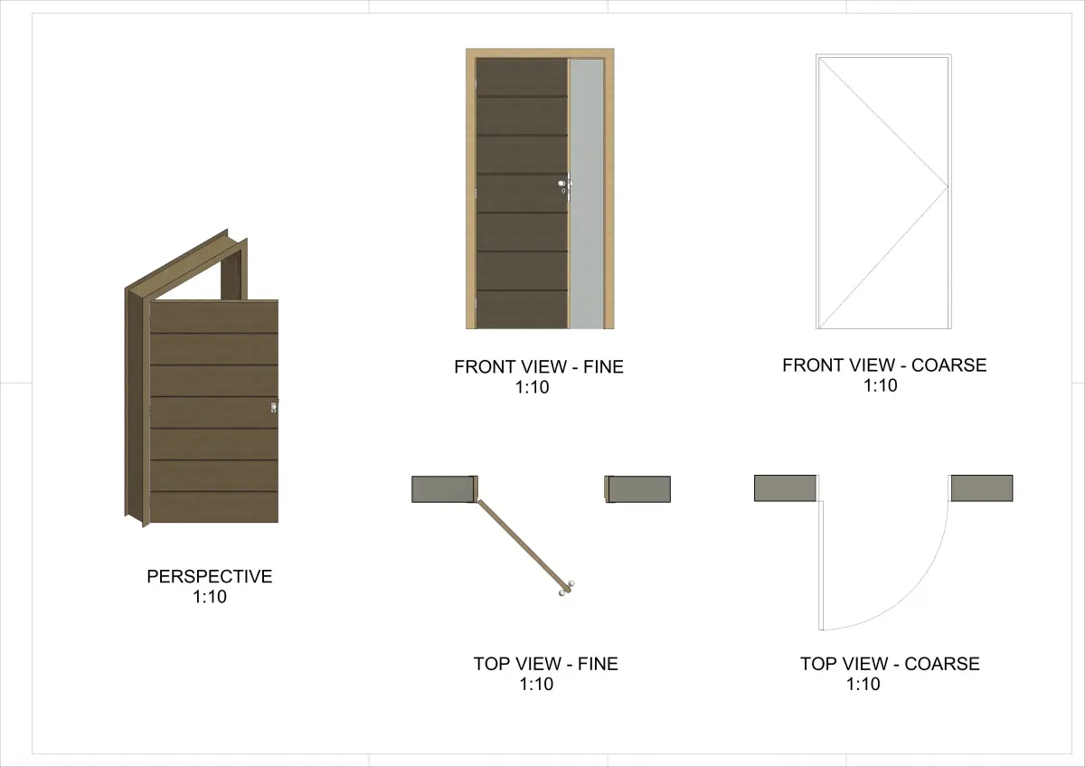 - Parametric Dimensions: The door is fully parametric, allowing for precise adjustments in the following dimensions: Height, Width,Length,Trim, Jamb, etc.
