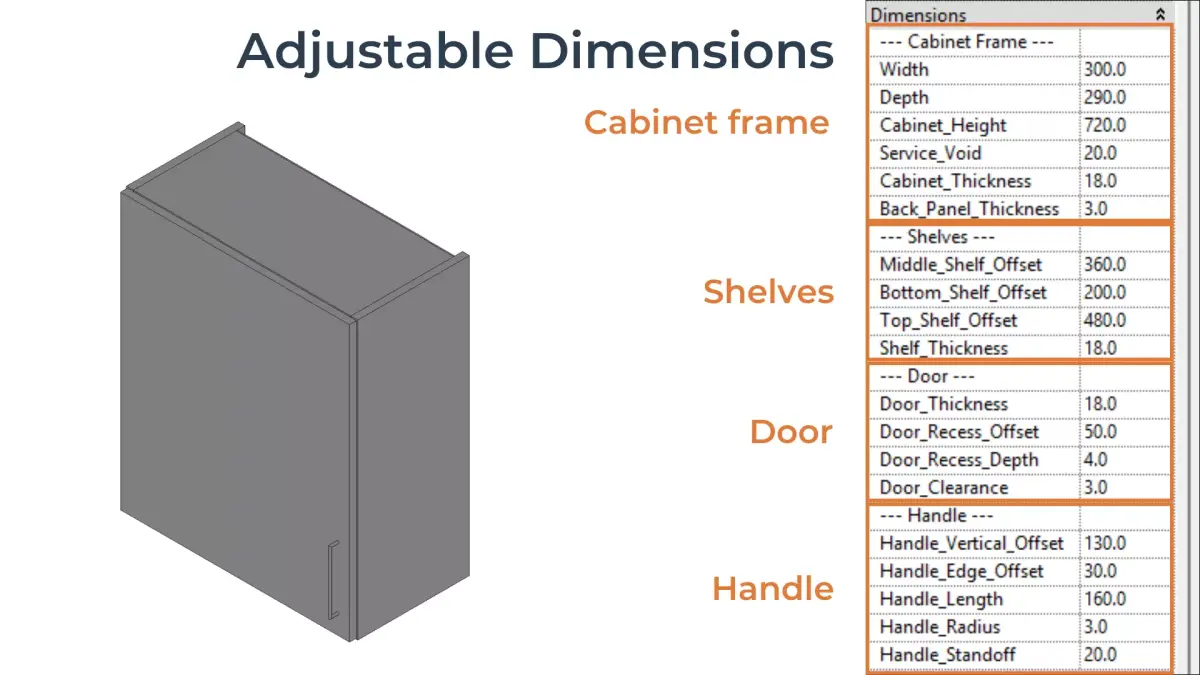 - Adjustable dimensions for cabinet frame, door, shelves, and handle