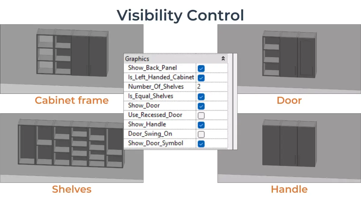 - Independent visibility for swing arcs and door side indicators. Based on the cabinet orientation, the correct left or right symbols will be shown automatically.