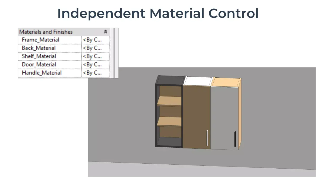 - Editable materials for cabinet frame, back panel, shelf, door front, and handle