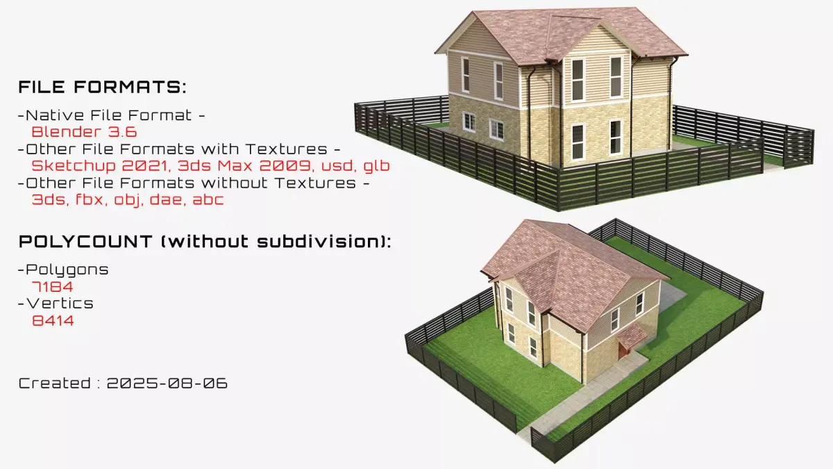 BLEND (Blender, filesize: 1.7 MB), OBJ (OBJ, filesize: 138 KB), FBX (Autodesk FBX, filesize: 222 KB), MAX (Autodesk 3ds Max, filesize: 1.81 MB), GLTF (glTF, filesize: 6 MB), DAE (Collada, filesize: 1.53 MB), JPG (JPG, filesize: 6.37 MB), ABC (Alembic, filesize: 173 KB), 3DS (3D Studio, filesize: 129 KB), USD (USD, filesize: 1.32 MB), SKP (Sketchup, filesize: 1.92 MB)