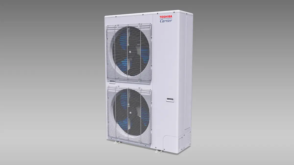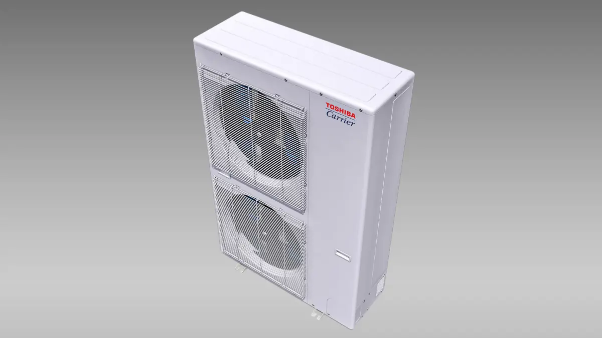 Detailed 3D model of a Single-phase Toshiba Carrier VRF Heat Pump Outdoor Unit, modeled and rendered in Cinema 4D. The model was created using approximate real world dimensions.