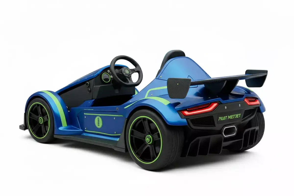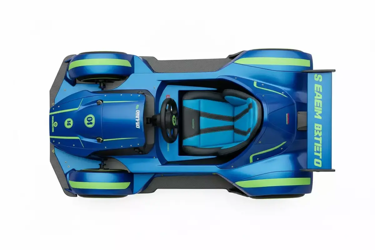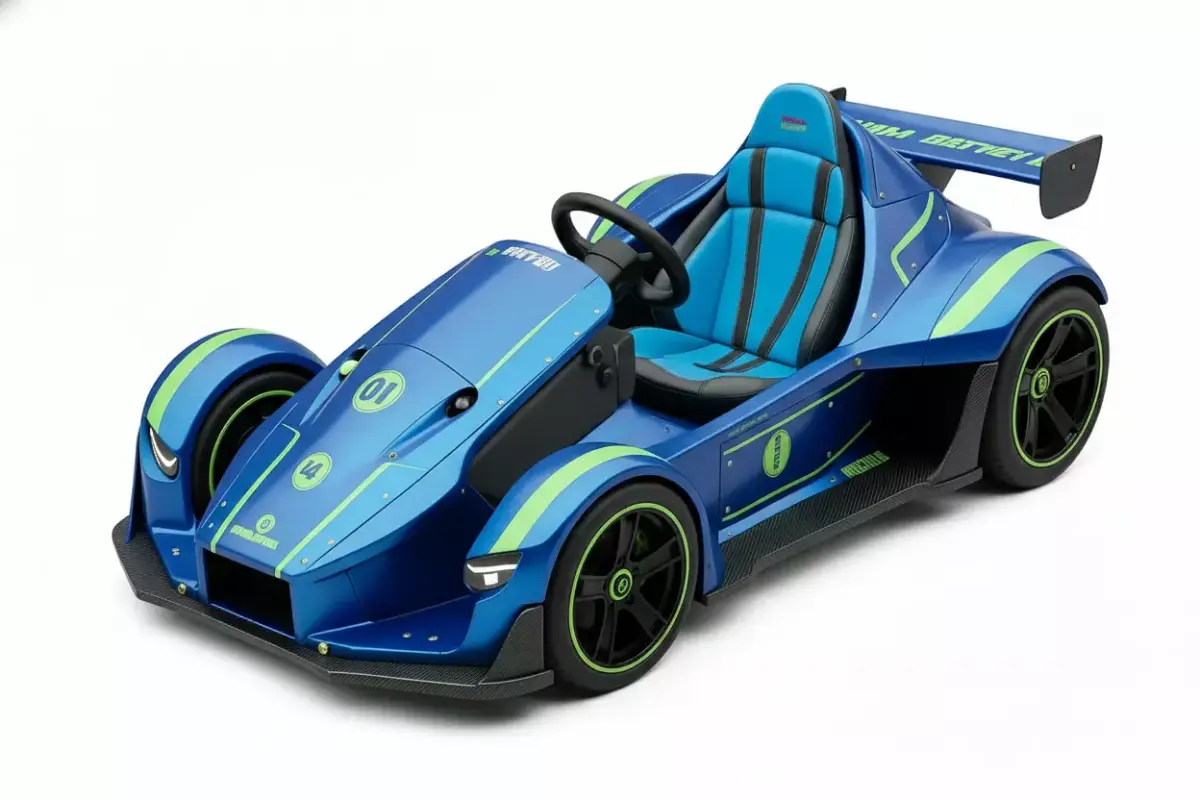 An aggressive, single-seater track day racer or high-performance go-kart. The vehicle is finished in a striking metallic blue paint, accented sharply by vibrant lime green stripes and trim, giving it an energetic, competitive look. Key features include the open-wheel design (with the front wheels partially covered), a large rear wing, and a low-slung, aerodynamic body. The seat is prominently featured in blue and black upholstery, matching the exterior color scheme. The model incorporates details like black wheels with green outer rings and visible carbon fiber textures on the front splitter. This asset is ideal for racing games, extreme sports visualizations, or any project requiring a distinct and visually exciting track vehicle.