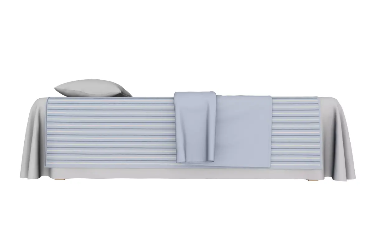 The bedding arrangement includes a striped blanket or runner in shades of blue, grey, and white, lying across the length of the bed. This is topped with a solid light-blue throw blanket folded neatly across the middle, adding a layer of texture and comfort. A simple, light-grey pillow is placed at the head of the bed.