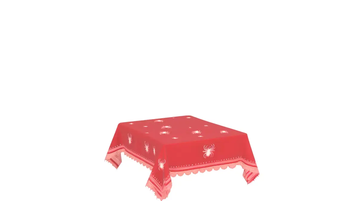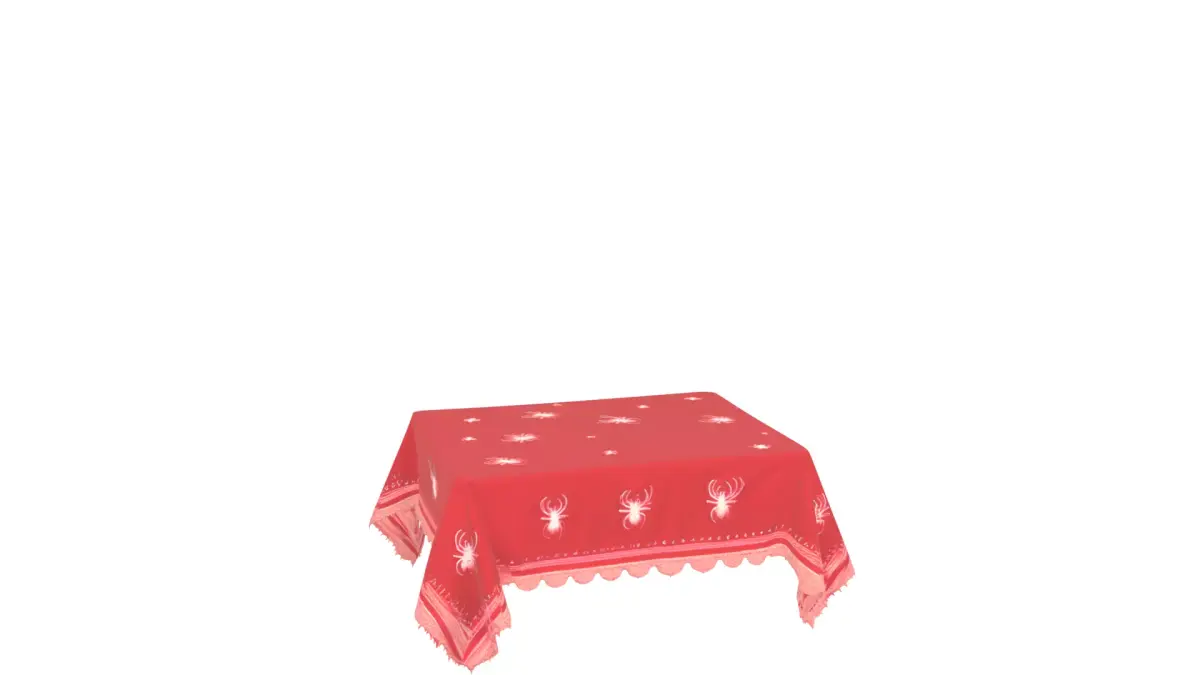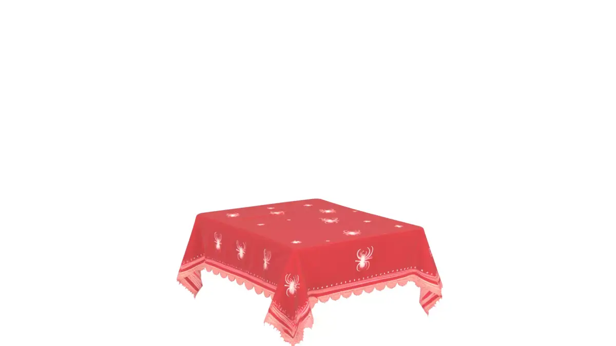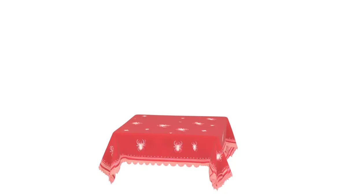 A hauntingly elegant blood-red tablecloth featuring intricate white lace edges and delicately embroidered spiders, perfect for adding a gothic or eerie atmosphere to your 3D scenes. The cloth displays realistic stain patterns in varying shades of crimson, with four distinct views showcasing the front spread, detailed back lace, scattered stains from the left perspective, and the spider embroidery details from the right angle. Ideal for horror games, dark cartoons, or gothic-themed dining room visualizations, this highly detailed 3D model captures the texture and mood of a vintage yet sinister table covering.