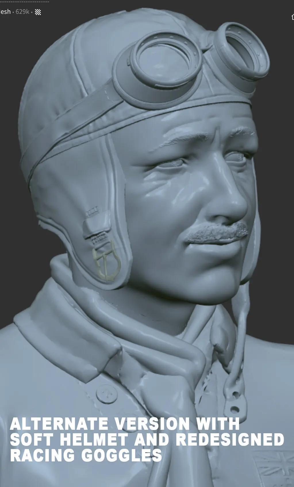 November 7, 24: I am happy to present an alternative version of the model with a leather/fabric racing helmet like the one the original Sir Birkin wears on some photos. I have also redesigned the racing goggles for this version and repaired some minor issues with the shoes. I made the changes a few days ago, but had the model testprinted on two different printers which took some time - I hope this explains the date stamp on the model file which is from 24-10-21. The model comes in a hollow version with 2,5 mm shell thickness and in a solid version. Have fun with the model!